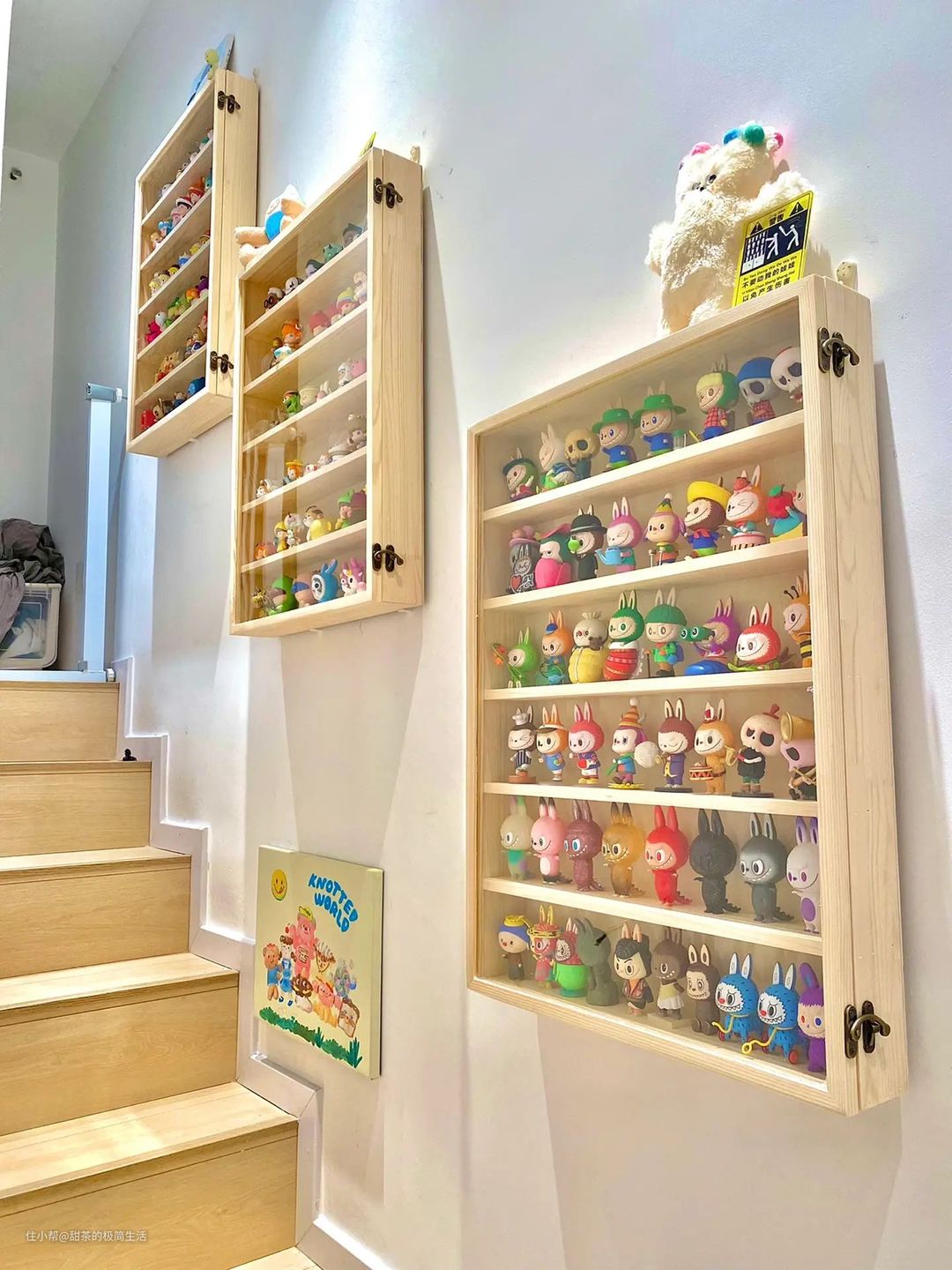 楼梯的侧面墙壁,用三个大小一致的木质亚克力盒子做装饰,里面整齐地摆放着屋主的手办收藏。