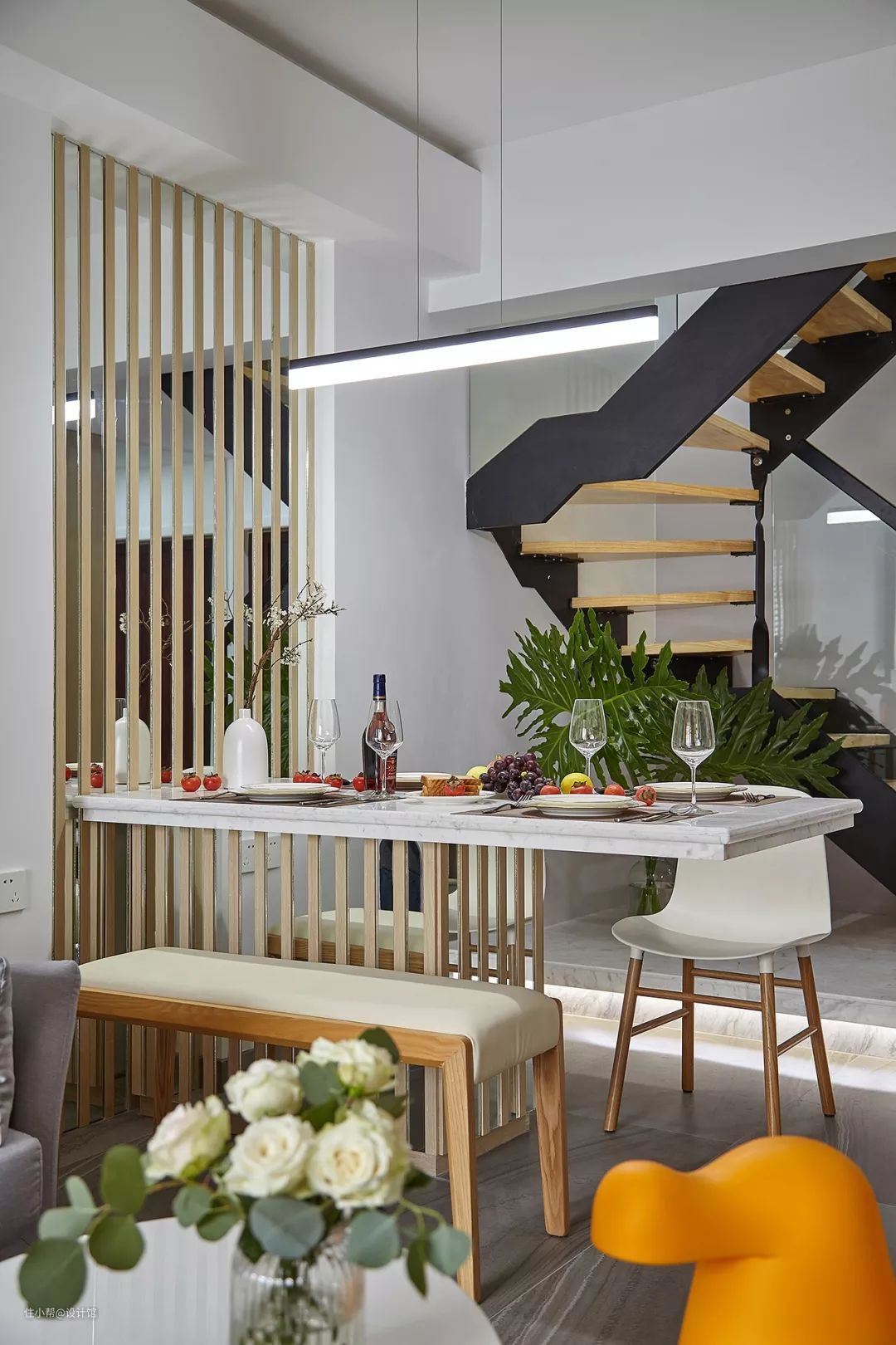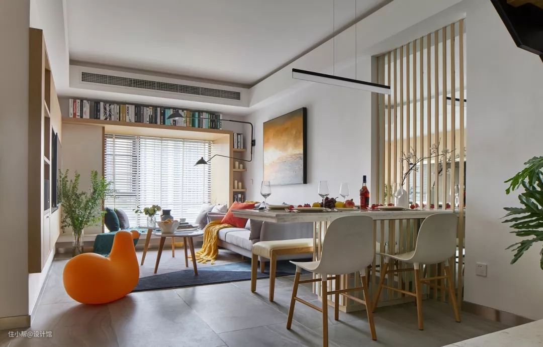 ▲餐厅挨着客厅布置,餐桌以石材台面的材质,与旁边的屏风连为一体做成定制设计,搭配上简约的餐椅与板凳,结合客厅上橘色的抱枕与创意凳子,营造了一个简约而温馨的客餐厅空间画面。