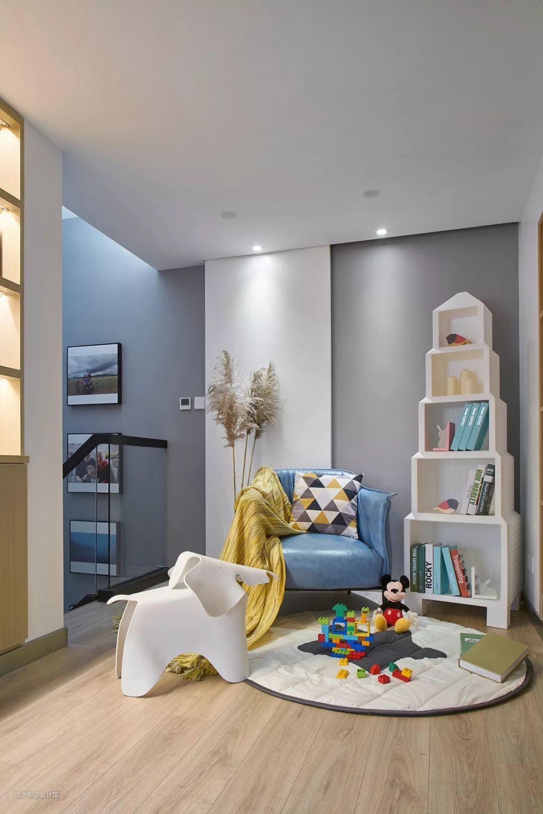 ▲二楼楼梯口这个空地,摆上儿童椅子与凳子,加入小书架与地毯,布置出孩子玩耍阅读的小空间,温馨舒适而童趣。