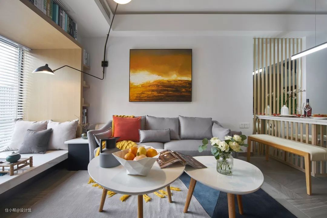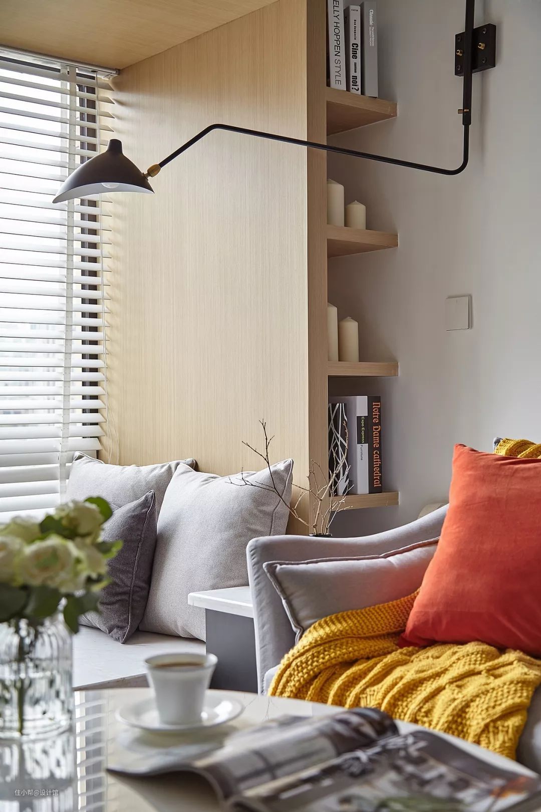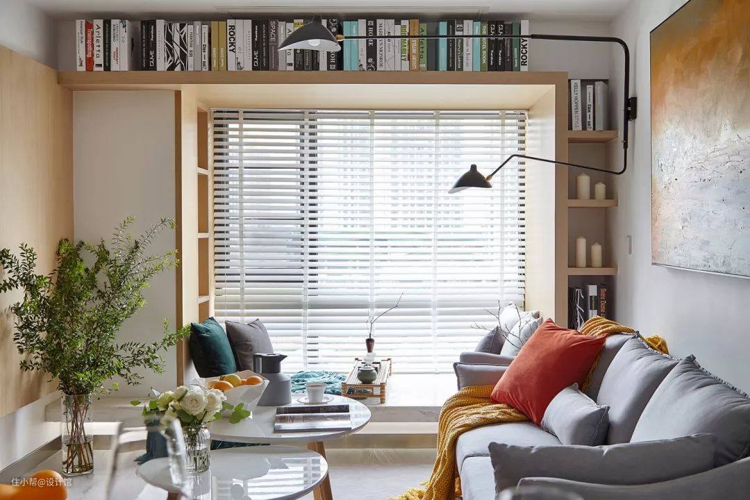 ▲客厅面积不大摆上双拼椭圆茶几,搭配灰色布艺沙发,飘窗以书架+木饰面包围,窗户装上百叶帘,让空间显得格外的文艺简约而自然舒适。