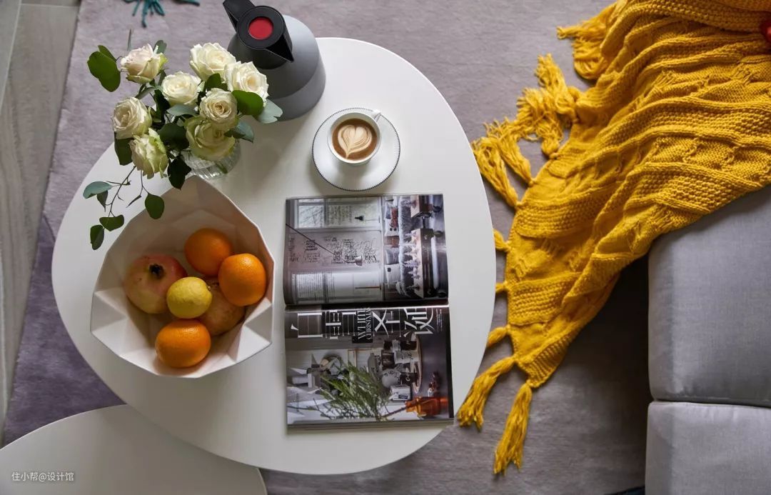 ▲三角圆形的茶几,摆上果盘、花瓶与杂志,结合沙发上的黄色毯子装饰,也呈现出了一种现代优雅的文艺氛围气息。