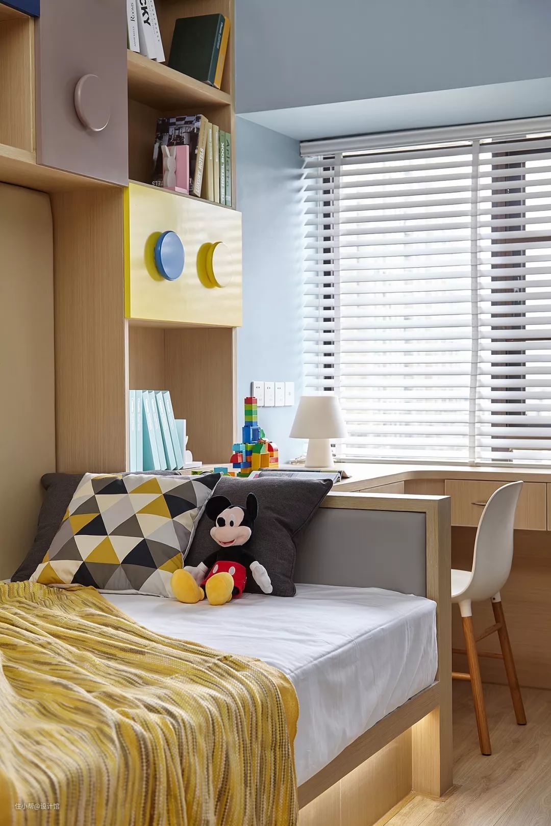 ▲儿童房以挺支持+书桌的组合设计,床铺设在进门左侧,定制床还在床架下加入了灯带,为空间提供了温馨自然的照明体验,铺上白色床单+黄色毯子,给人一种简约自然的舒适感;靠窗定制书桌+书架,书架还延伸到了床铺上方,灰色与黄色的书柜门,窗户以百叶帘设计,使得儿童房空间更加明亮而童趣。