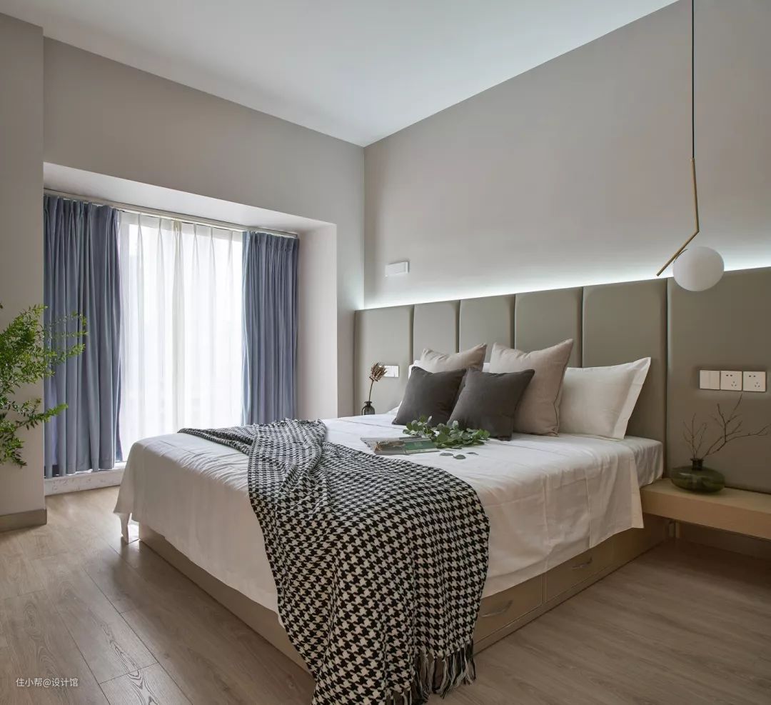 ▲卧室以浅色木地板的空间基础,床头墙是墙脚区域装上皮艺软包+乳胶漆墙身的组合,布置上皮艺材质的床架+床垫,搭配白色床单、灰白配的抱枕,床头还加入了暗藏灯带设计,让空间显得现代优雅而朴素舒适。