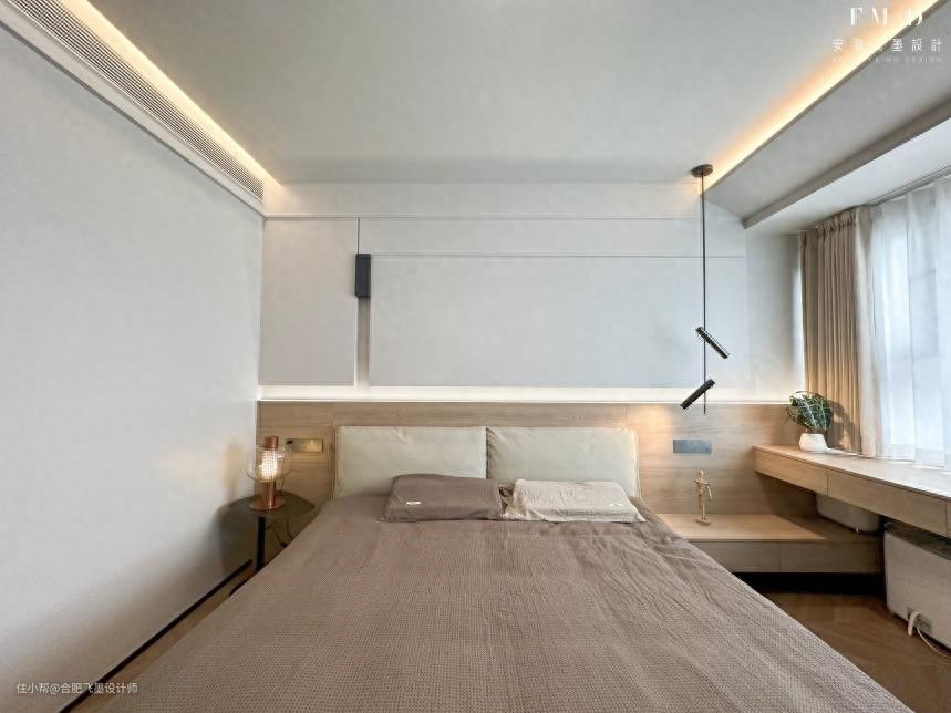 床尾空间也没浪费,选择在这定制一整面衣柜,一门到顶造型外观足够简洁大方,内部收纳力也很充足,不管是挂衣区、叠衣区还是被褥区等,足以满足业主的多样性收纳需求。