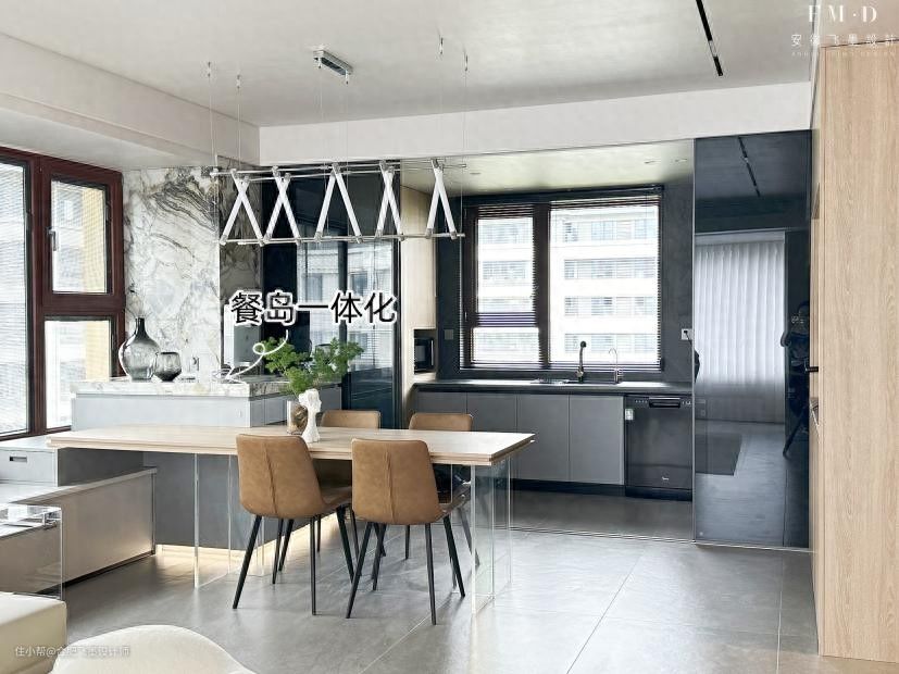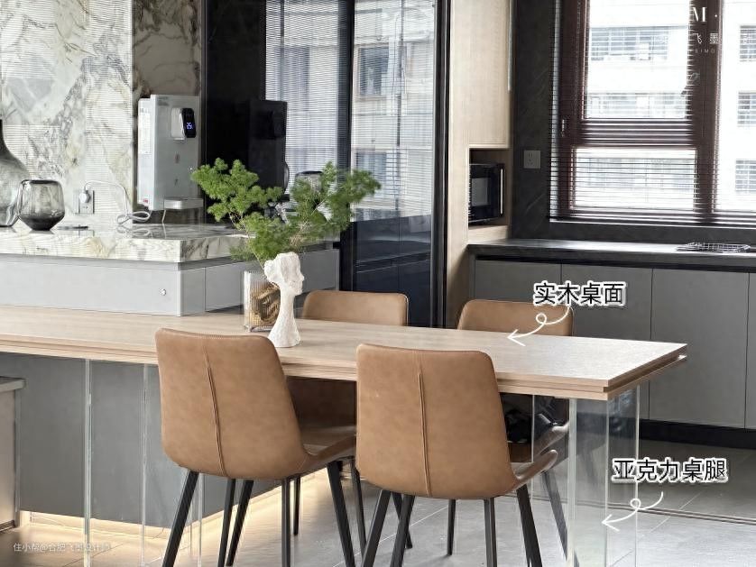 另外餐桌也与岛台连为一体,实木桌面+亚克力桌腿,看起来就像悬浮桌,在这用餐也是舒适又自在。
