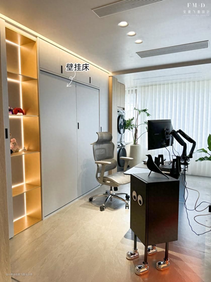 内部布局除了书桌外,背后还有一整面储物柜,壁挂床隐藏其中,平时和普通柜体没啥两样,等想要的时候就可以直接拉下来,被褥铺好往上一躺,舒适度直接拉满。