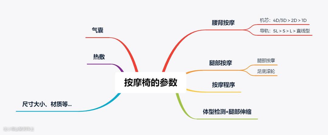 购买按摩椅这种大件首先考虑的就是品牌。像家用电器我们一般都会优先考虑德系日系的,其次是其它进口品牌或者国内知名品牌,不过按摩椅却不是这么选的。按摩这个东西本身就源于咱们中国,也更加流行于我们汉文化圈,反而是欧美在按摩方面是外行。所以现在市面上主流的按摩椅品牌也都来自于东亚和东南亚(包括我们国产的),像来自马来西亚的奥佳华,国产的荣泰,日本的松下等等,都是按摩椅领域的领头羊。而且主流品牌的售后一般也会更好,减少后期的麻烦。而关于选购按摩椅的参数,则可以总结为下面的这张思维导图: