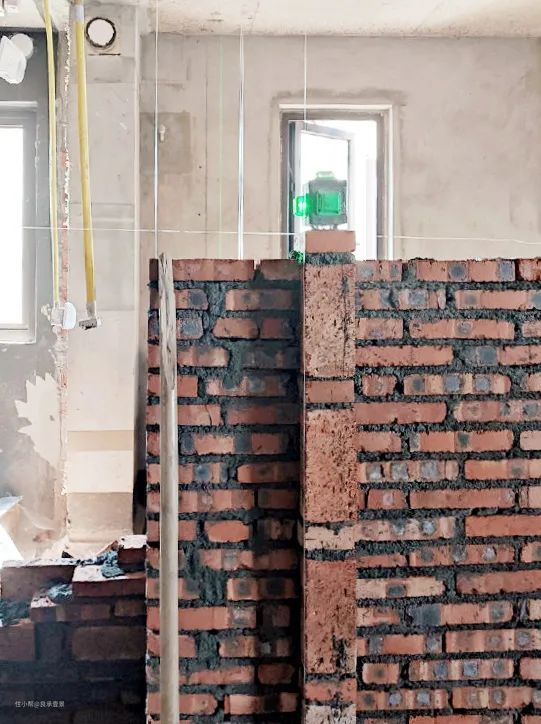 砌墙时使用垂线、水平仪保持新砌墙体的水平度和垂直度。采用“工”字型砌法,上下两层砖错缝搭砌,保持灰缝均匀饱满,水平厚度和竖向宽度大致为8-10mm。