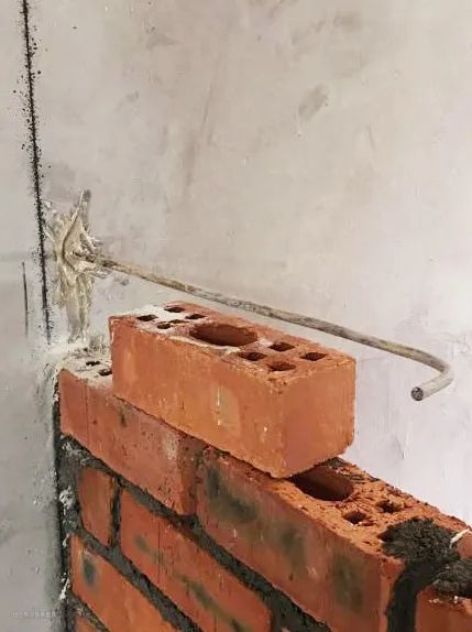 根据设计图标注植筋位置和数量,每隔500mm~600mm放置一条直径6mm钢筋。在新旧墙连接处打孔,将钢筋埋入并用植筋胶填实固定。多出钢筋留在新砌墙内,圆钢末端需要回弯成90°。