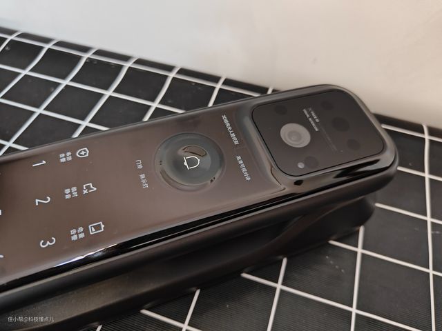 正面上部分是人脸识别镜头和视频摄像区,中间铃铛符号是门铃了,在下面密码和NFC刷卡区域了,指纹解锁设置在把手里面的好处就是不用担心客人误触造成智能锁锁定了。