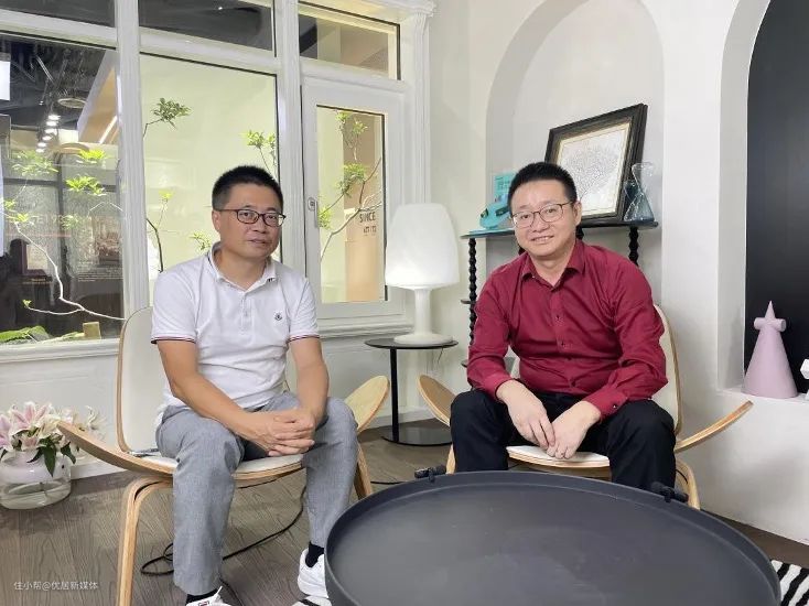 优居副总裁、优居研究院院长张永志(左)对话瑞明柚木窗董事长董呈明(右)