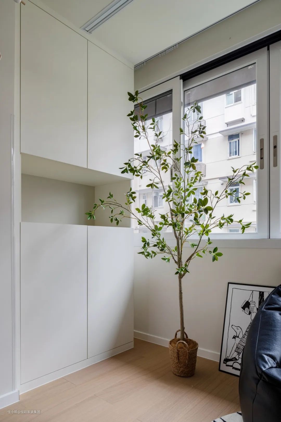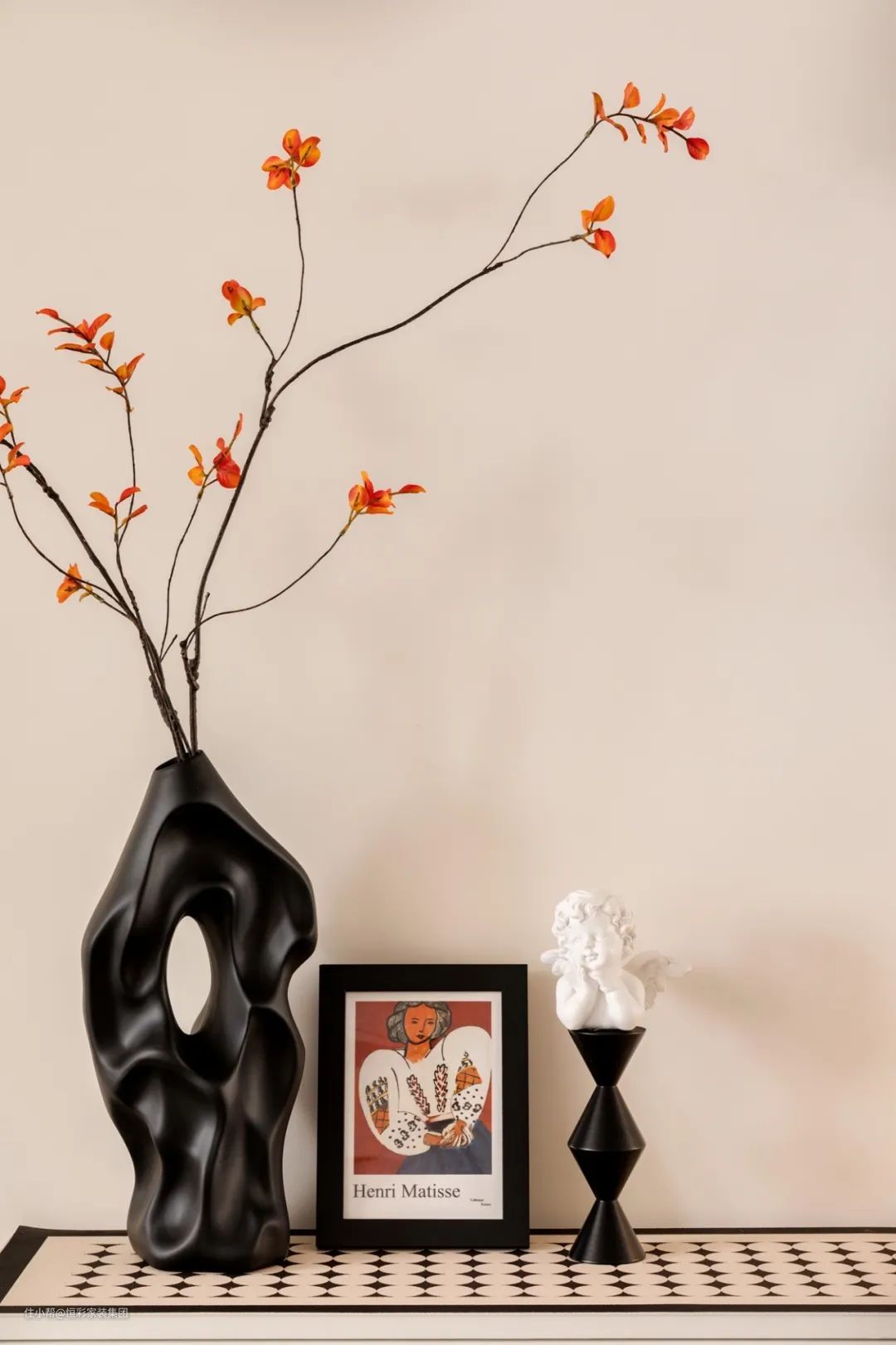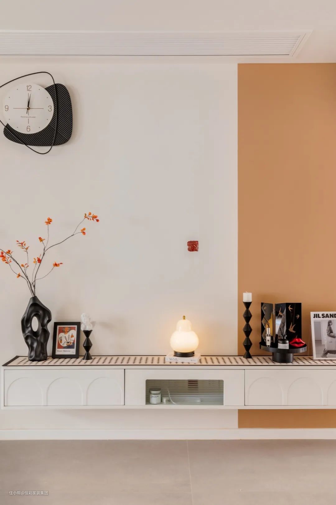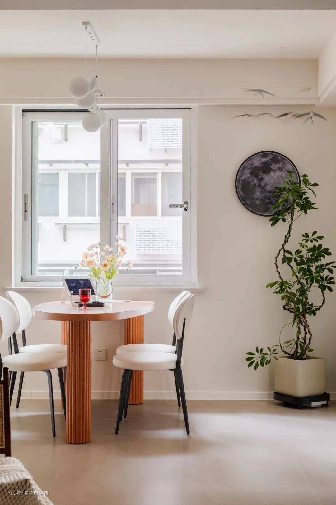 餐桌靠窗摆放,采光绝佳,橘红+白的配色热情温馨,有助于提升食欲。一杯红酒,一部电影,一念时光。角落的鸭脚木亭亭玉立,挂上一幅水墨月球,给人无限遐想。