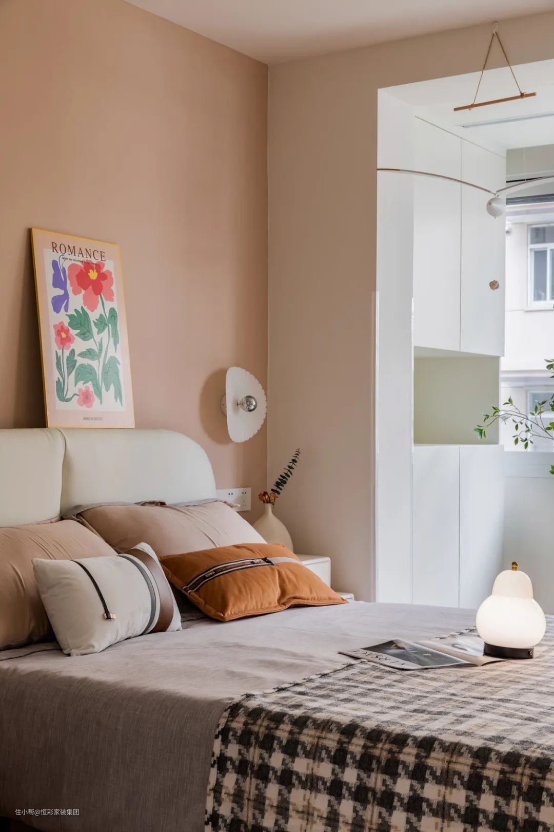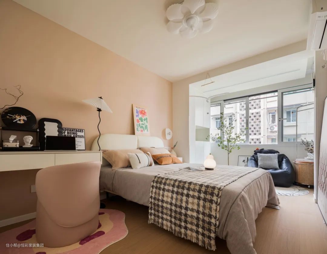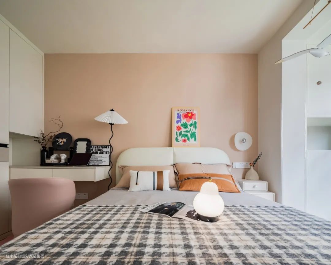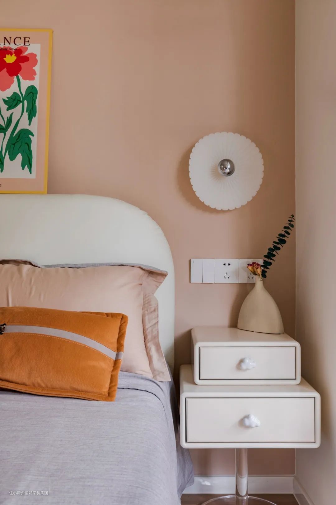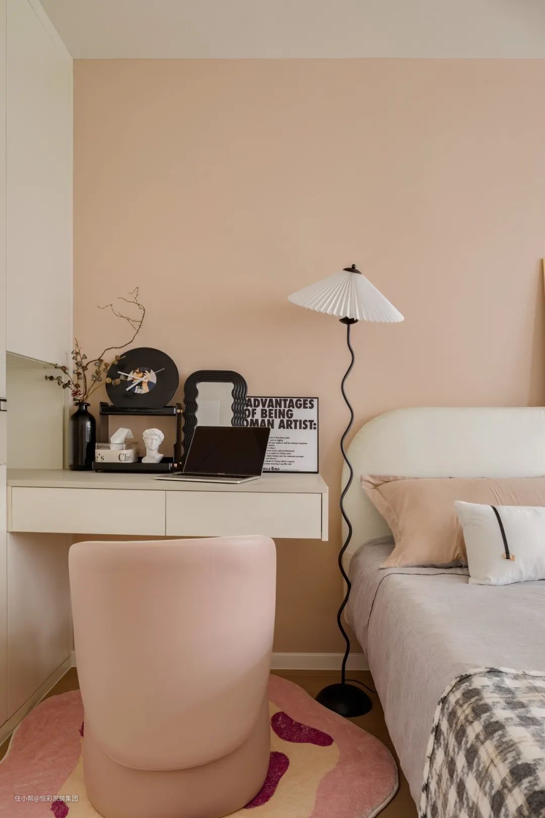 主卧像拥有了落日的颜色,淡淡的橘粉色墙面与白色搭配淡雅温暖,床头利用衣柜与墙的转角空间设计悬空床头桌,高级精致。不得不说梳妆台游戏桌一体确实fei常实用!