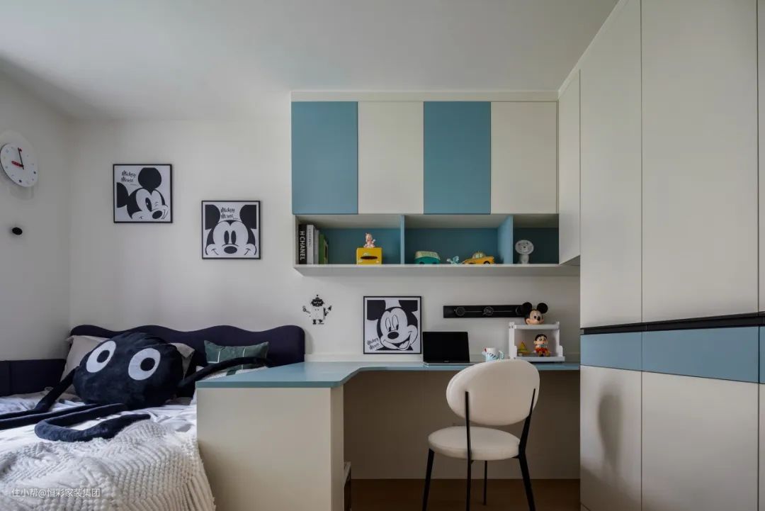 儿童房配色像是拥有了蓝天白云的晴朗好天气,可以直接与窗外的蓝天白云相融。榻榻米+收纳学习一体柜完全满足休息+学习+收纳功能。