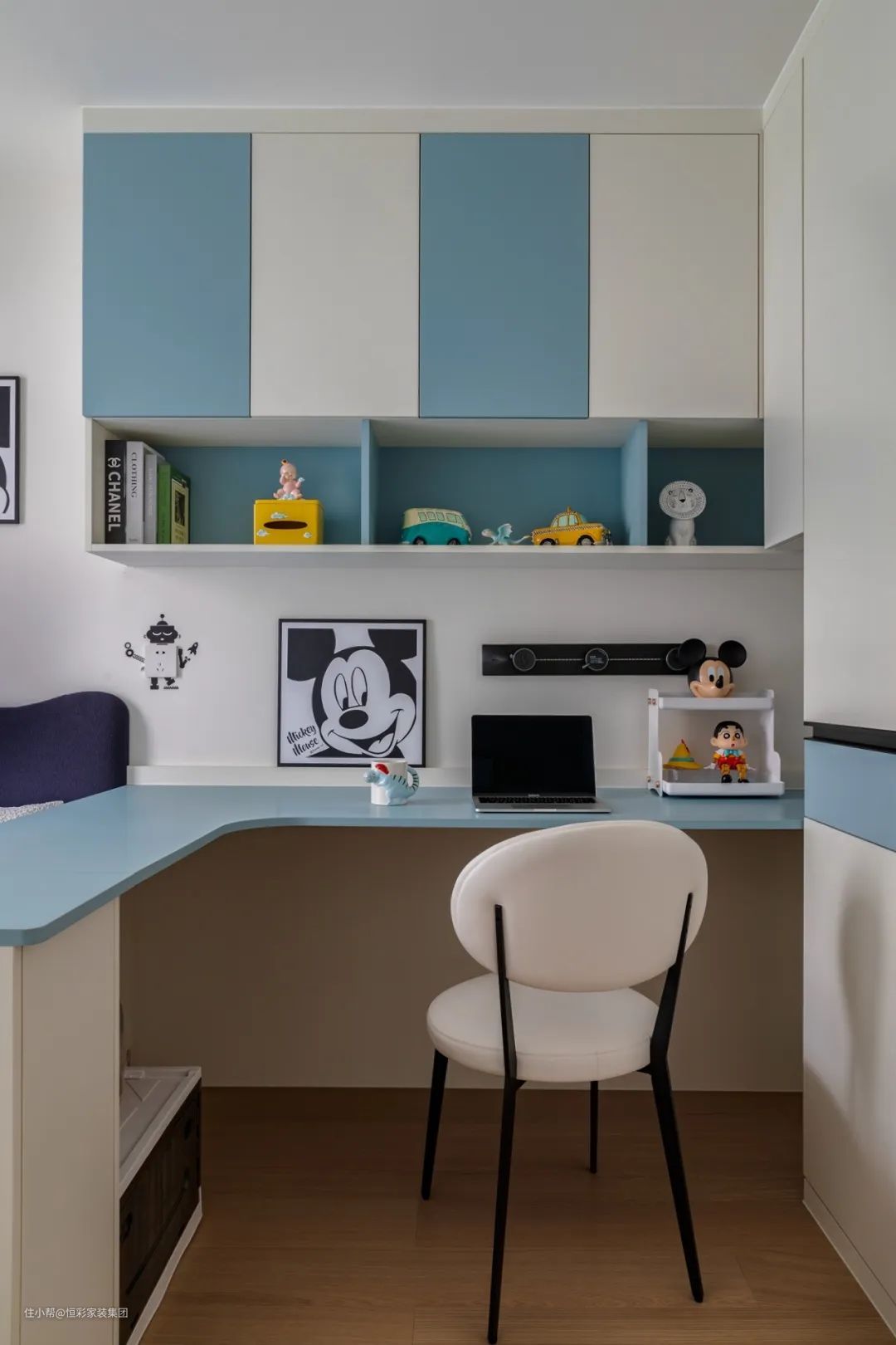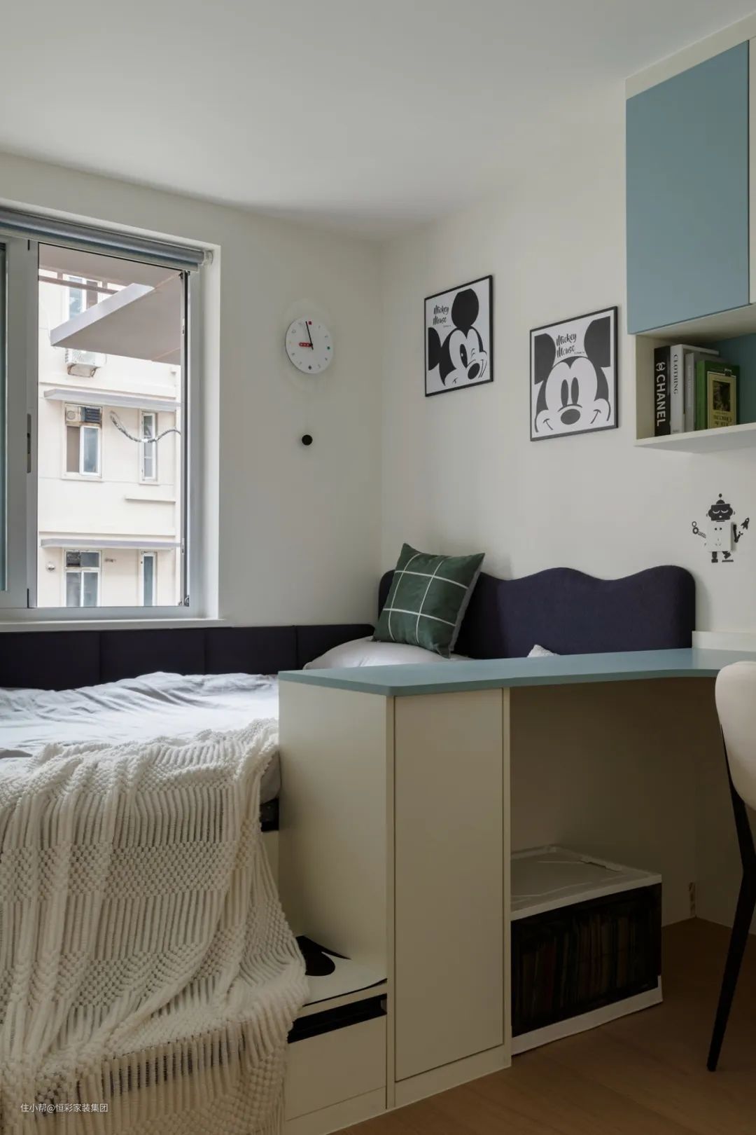 定制与床一体的转角学习桌,既能起到床边护栏的作用,又延伸了桌面空间和收纳空间。转角处还做了圆弧处理避免磕碰,又被设计师的细节暖心到啦~