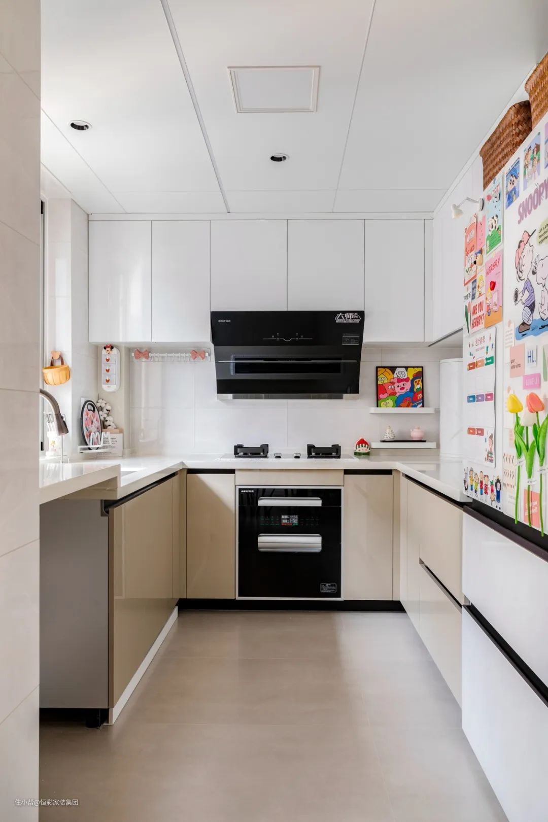 厨房地面通铺米灰色地砖,U字型布局设计,让屋主拥有足够的操作台面,橱柜是与客餐厅更深一些的奶咖色调,简洁高级。