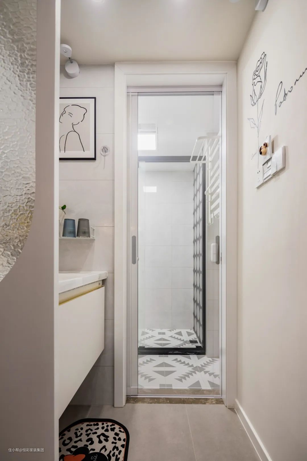 全屋只有一卫作干湿分离设计,磨砂玻璃砖影影绰绰颜值超高,还可透光改善干区采光,摆放上一束鲜花之后效果真是绝了~