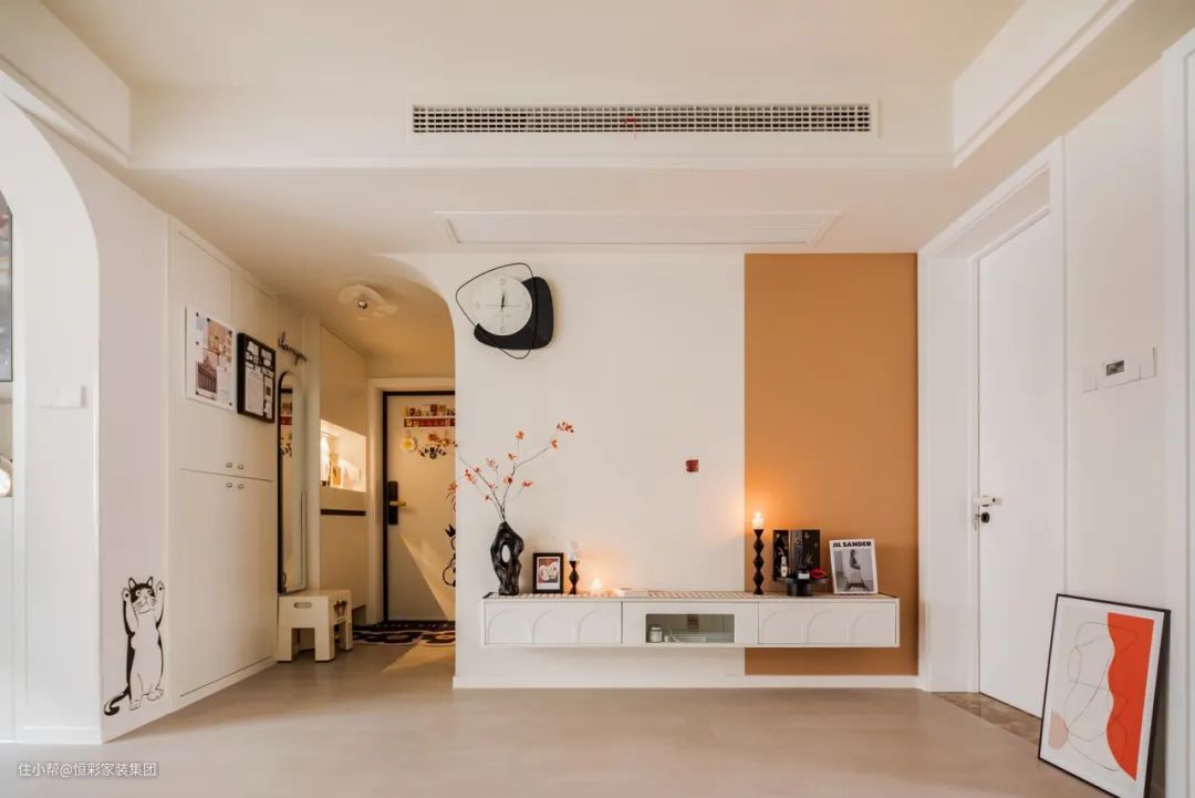 入户到客餐厅的过道空间充满巧思,安装感应灯带回家即开,并定制了嵌入式玄关柜+收纳柜,腰部位置两个小抽屉收纳小物件也超方便~