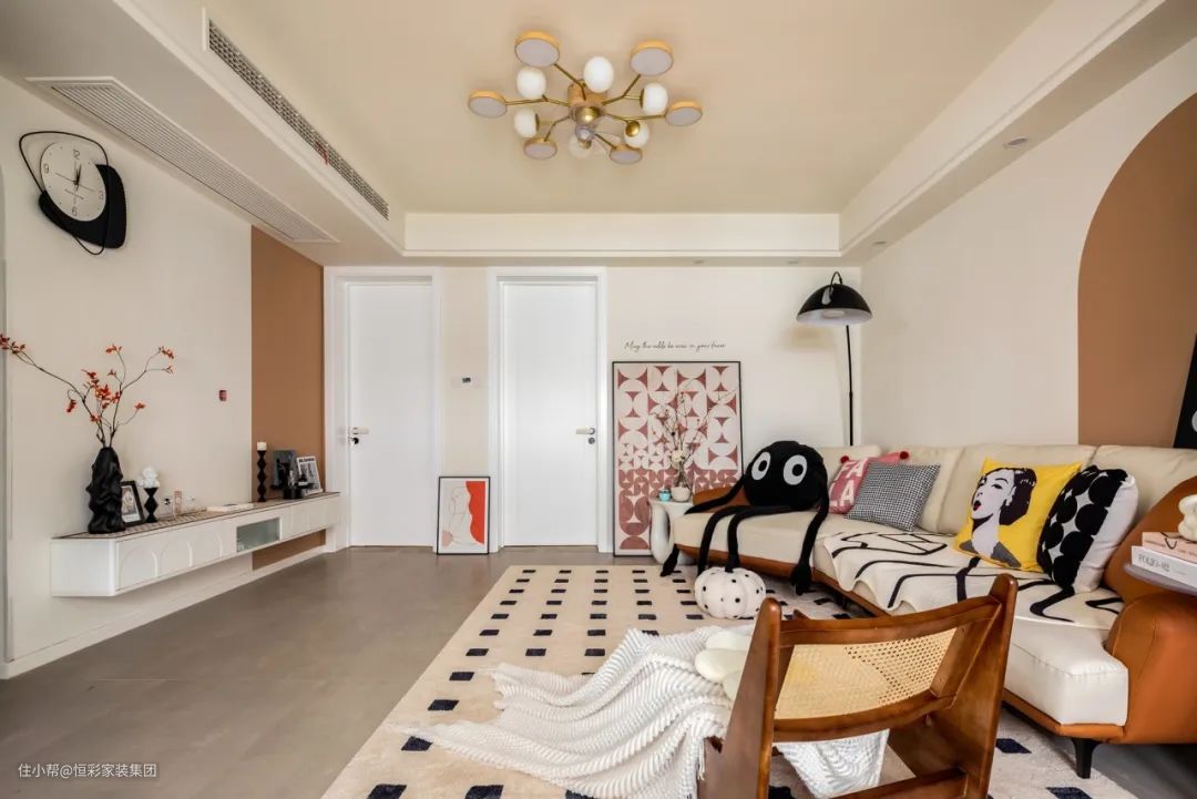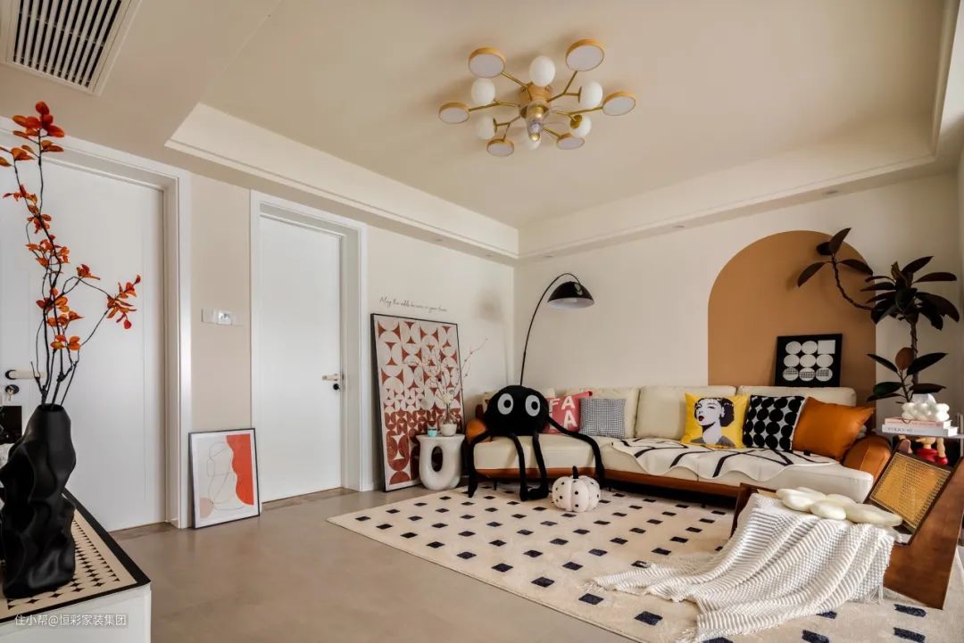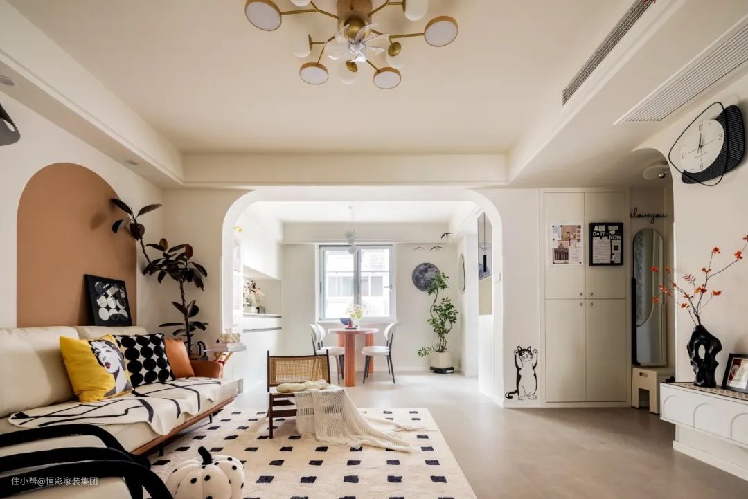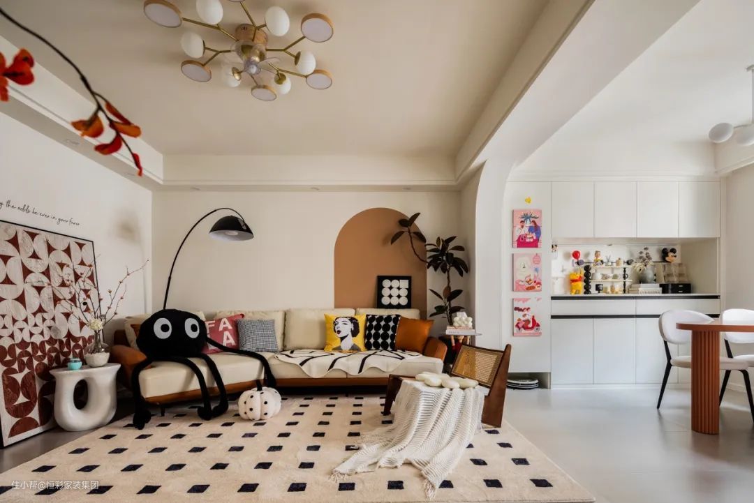 客厅是温温柔柔的浅色系,米白色柔光砖铺上格子地毯后直接提升了整体空间质感。客厅与餐厅隔而未离,门洞做的圆弧垭口设计进一步柔和了空间,给本身就温馨舒适的家又添了几分温柔。