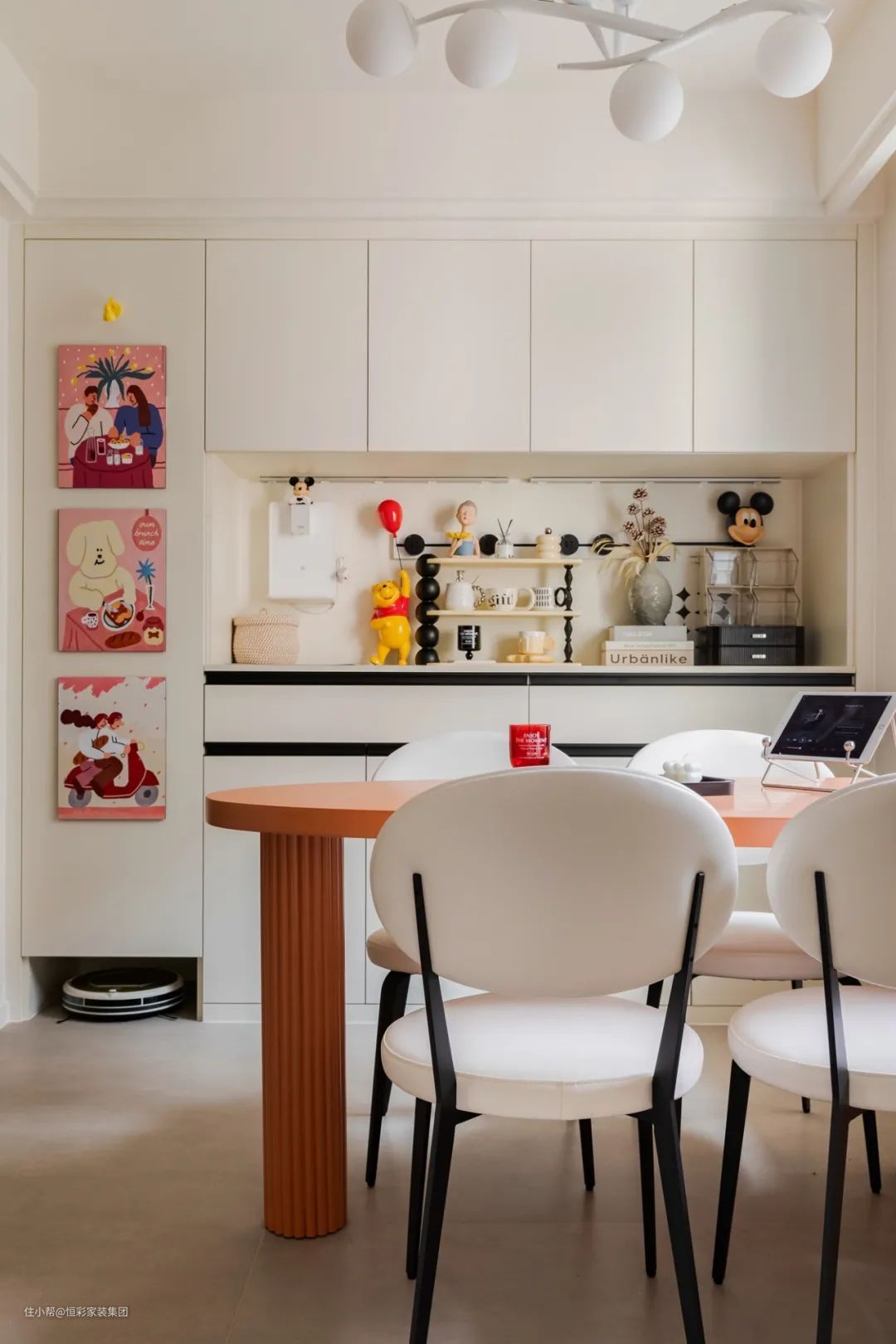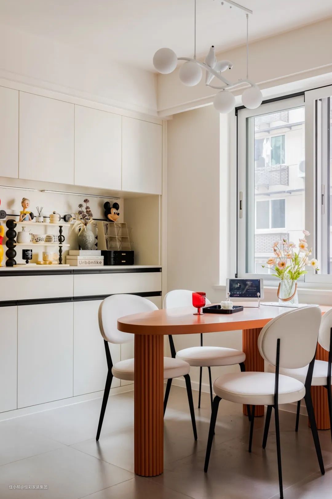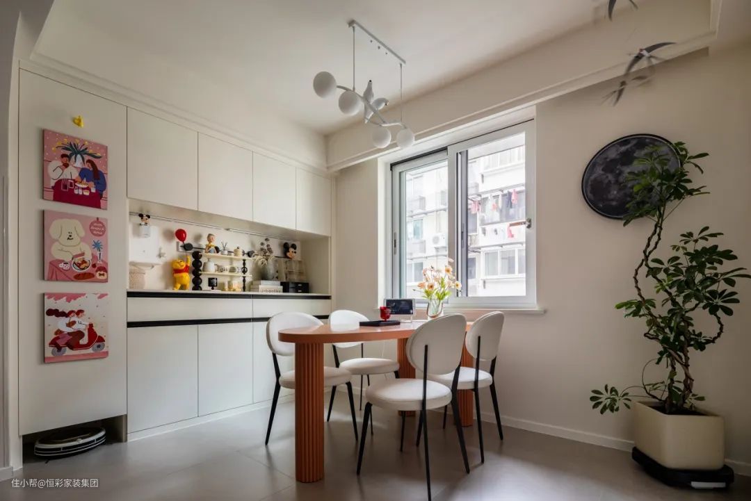 餐厅是由原客房空间改的,被温柔的奶白色包裹着,空间感刚刚好,随处可见的小挂件配饰,诉说着屋主对生活的热爱。