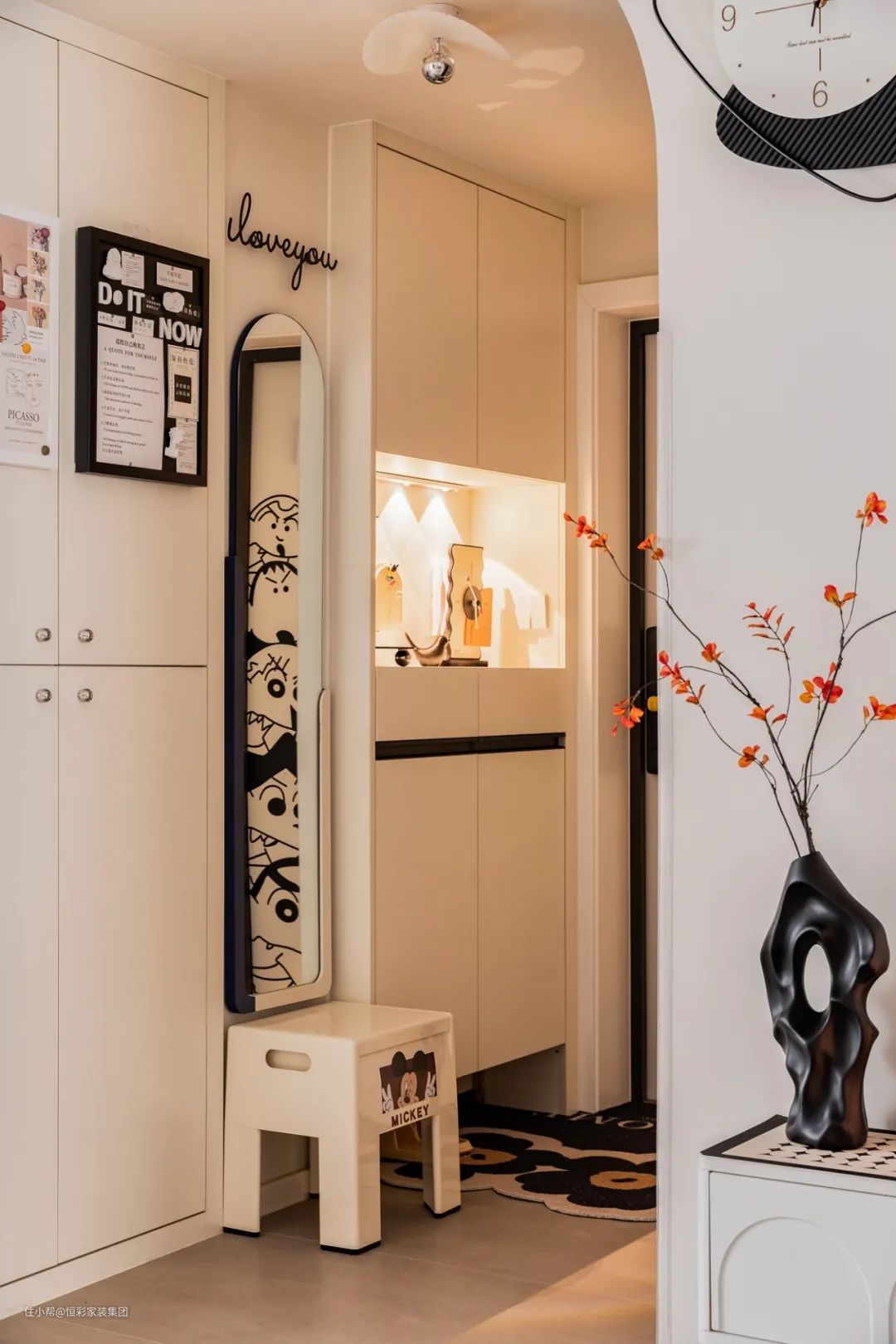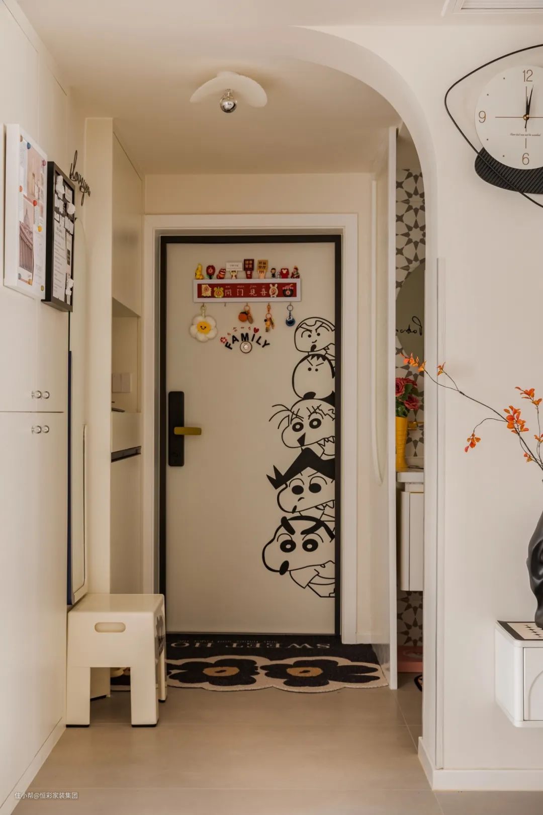 玄关一眼望过去就被这充满可爱童趣的区域所吸引啦,毛毡改变了入户门颜色,消除了原本的色差,整个空间搭配起来十分和谐统一!
