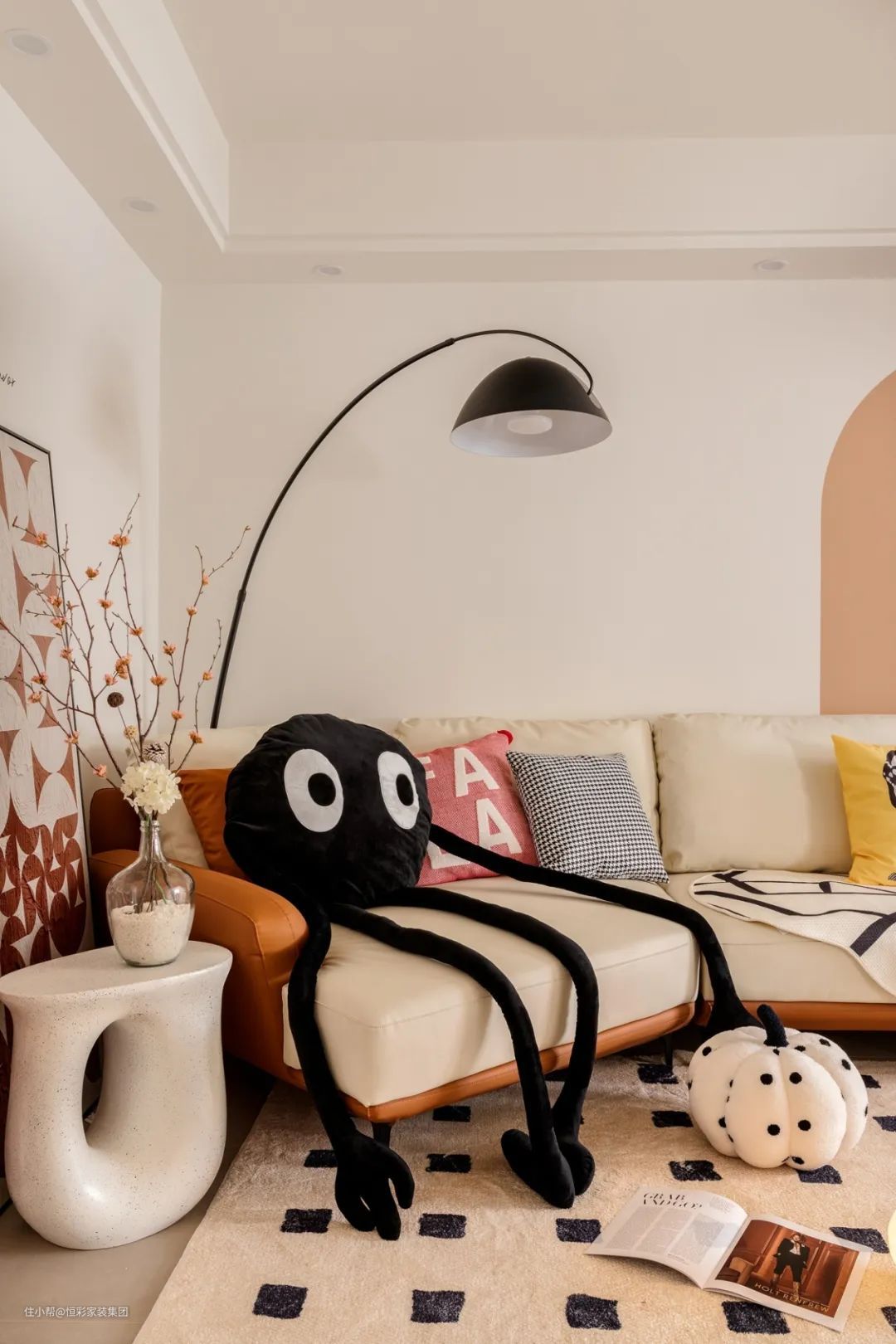 超长拐角沙发柔软度刚好,铺上地毯完全可以在这地方空间好好放空,简直太适合宅家一族啦。钓鱼落地灯搭配软萌可爱的小煤球玩偶,不同尺寸的装饰画散落各处,趣味横生不失设计感~