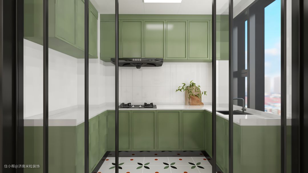 厨房冰箱放在餐厅,U型的橱柜设计,不仅颜值超高还很好操作,洗切炒动线流畅,墙面是白色瓷砖,地面小花砖的延伸感让厨房的空间看起来更大更宽敞,实用性也很好,也有放小家电的空间,厨房原有墙体给砸掉,做的四扇两轨推拉门,整体更通透一些。