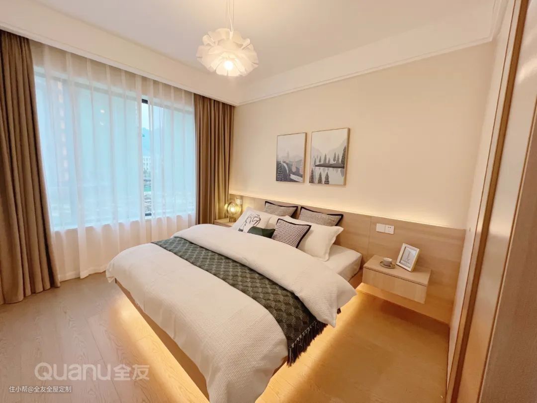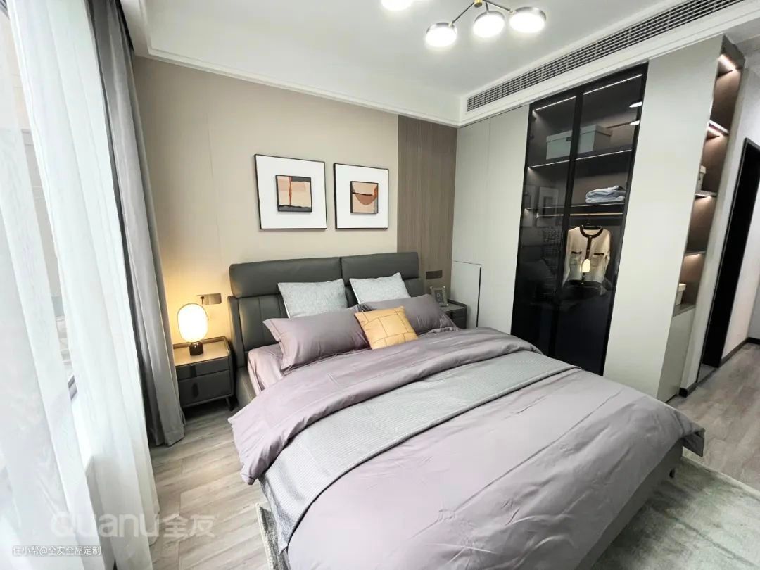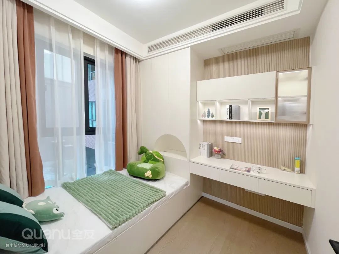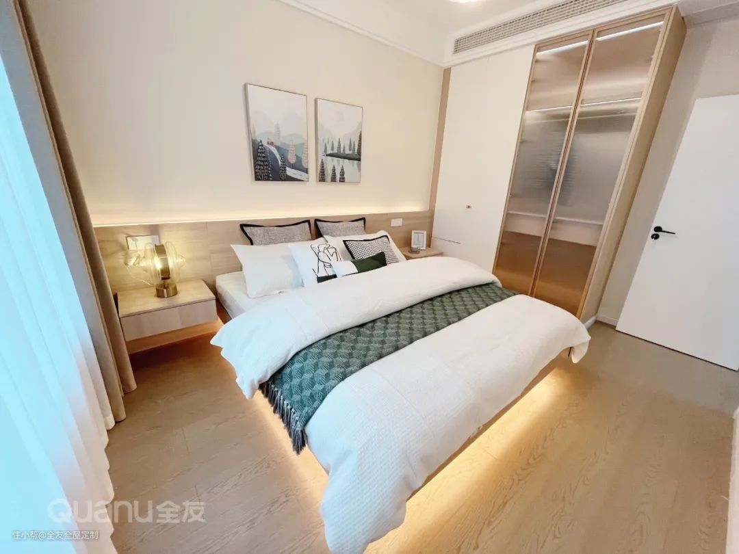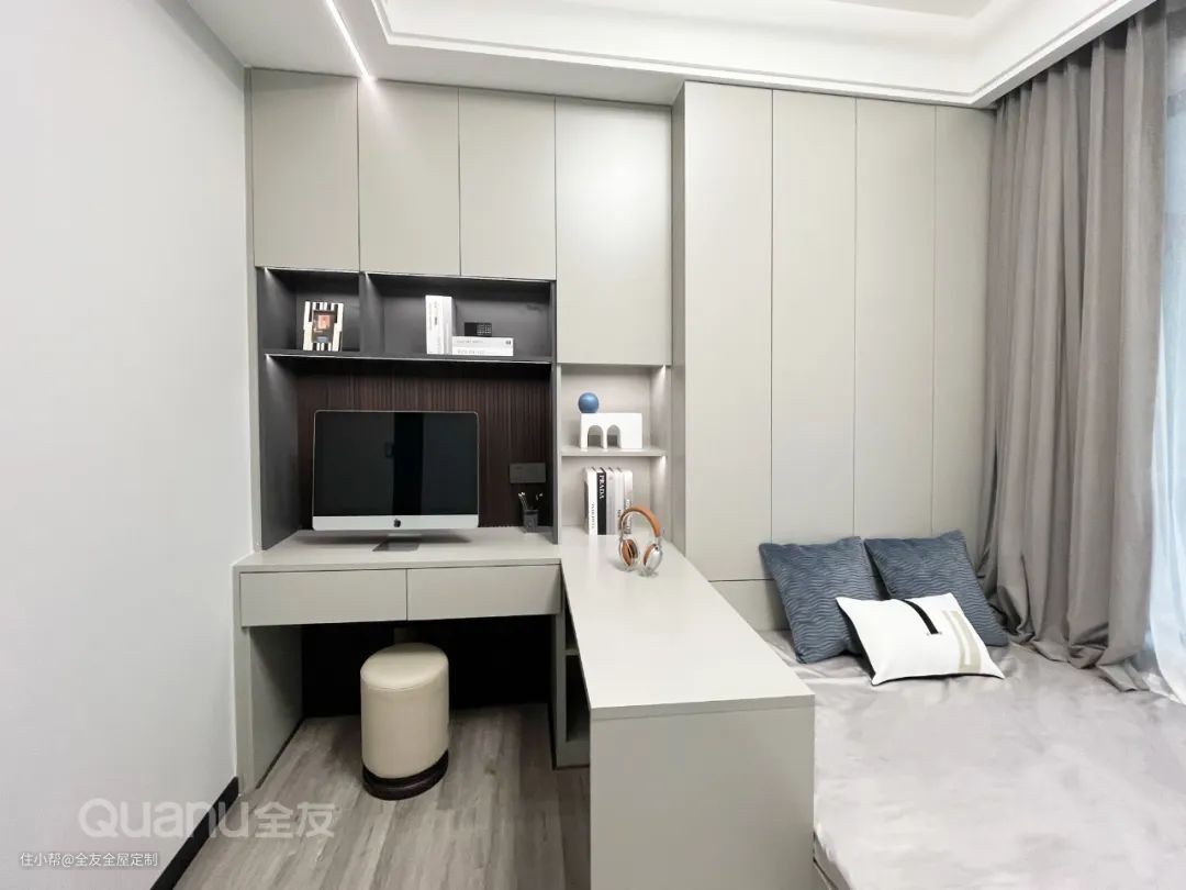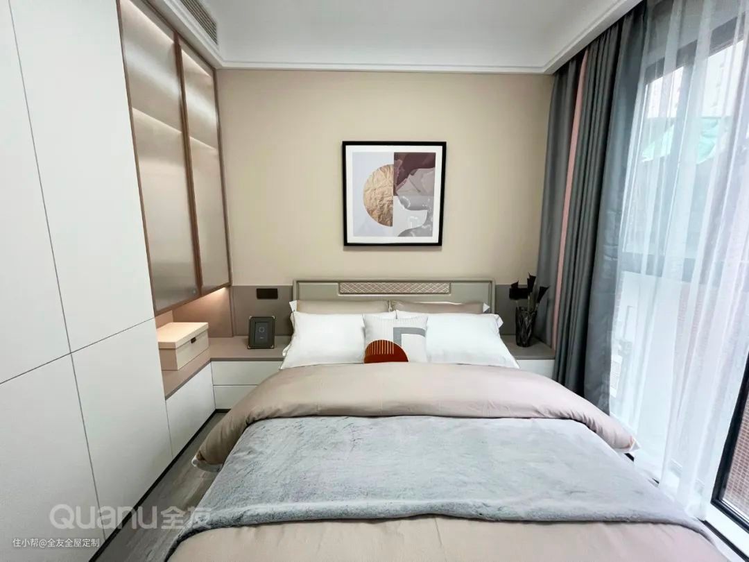 次卧定制整墙衣柜,搭配全友“未来派+·发光星球”系列的内嵌式拉手,安全又美观。衣柜内侧延展出台面作为床头柜,实用性拉满。