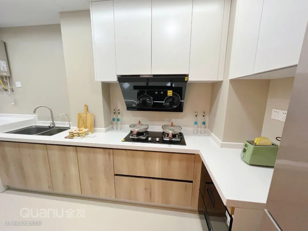 厨房呈L型布局,米白+原木橱柜自然又简约;设计师利用转角进行收纳,空间利用率高。