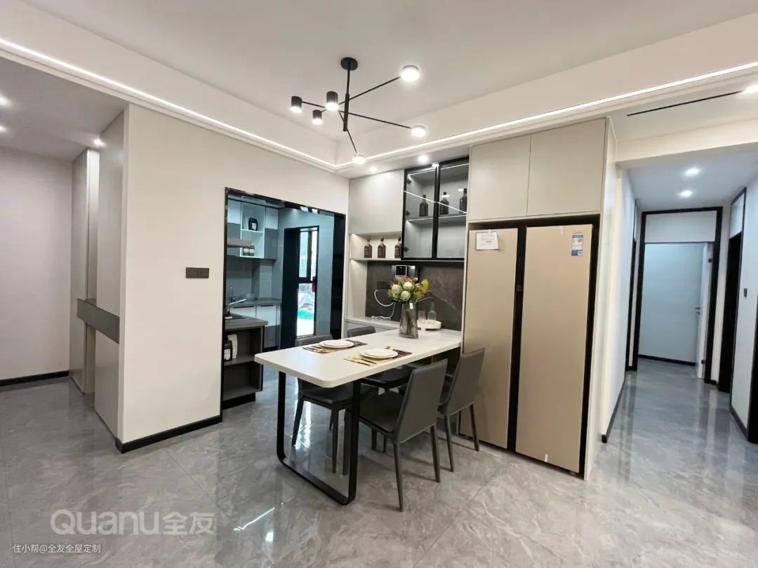 设计师还沿餐边柜留空处延展出台面作为餐桌,动线连贯自然,烹饪上菜一步到位。