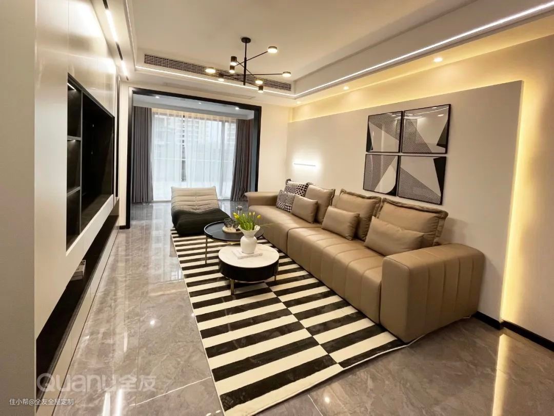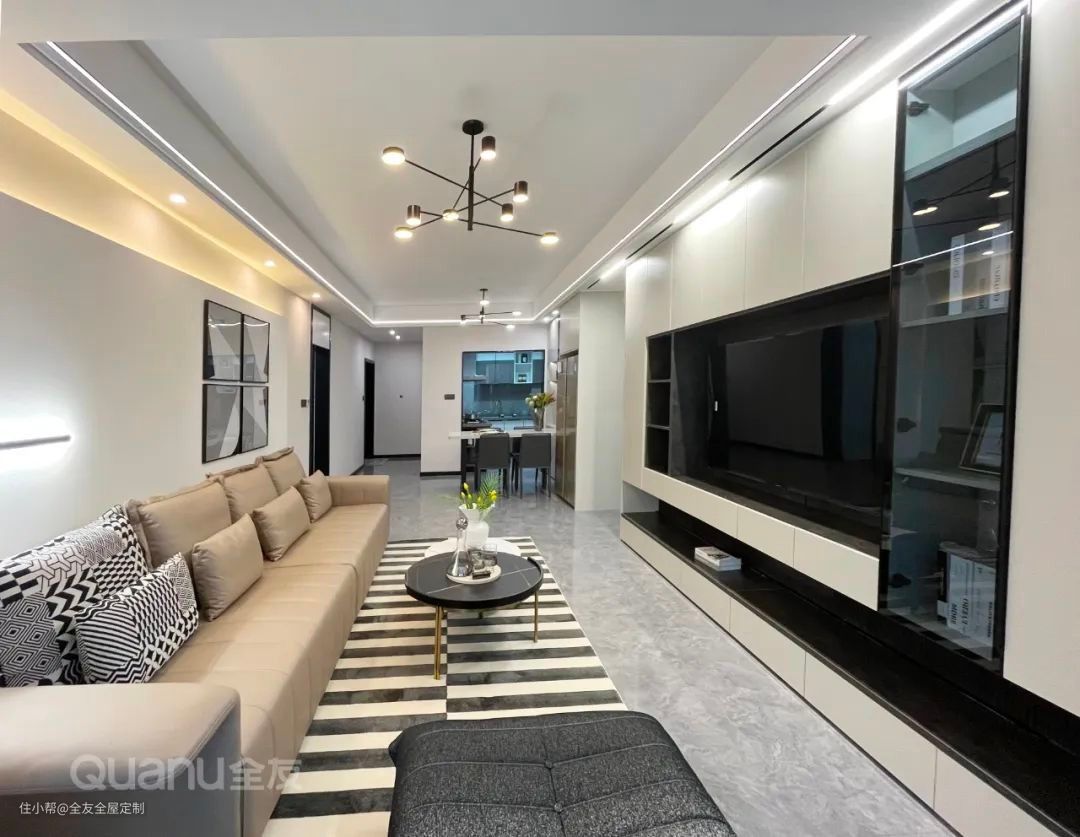 客厅定制整墙电视柜,底部留出一排开放格,削弱沉闷感,提升空间美感。