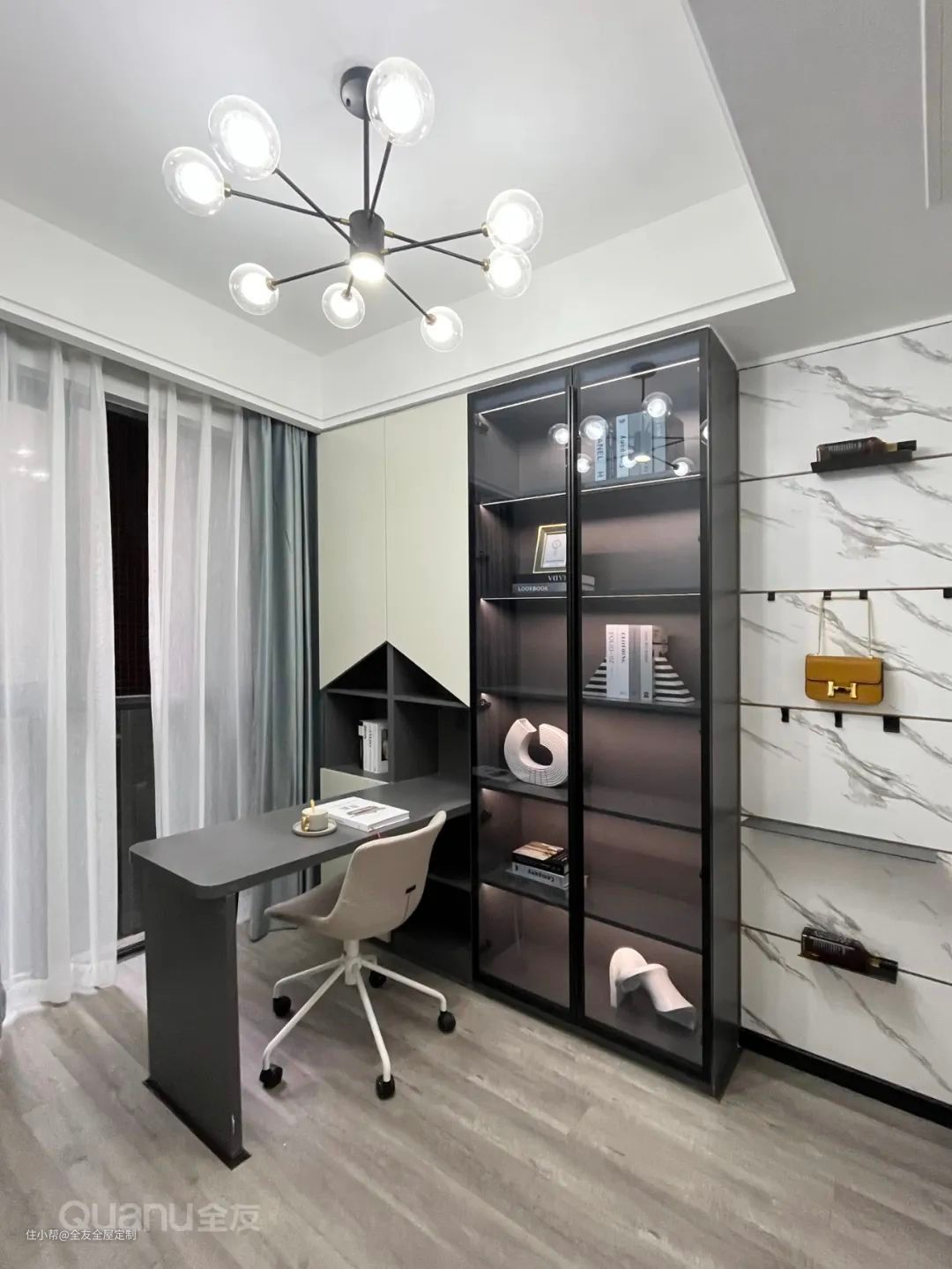 玻璃柜+灯带设计,柜体更显轻巧灵动,同时延展出台面充当书桌,功能与美感兼顾。