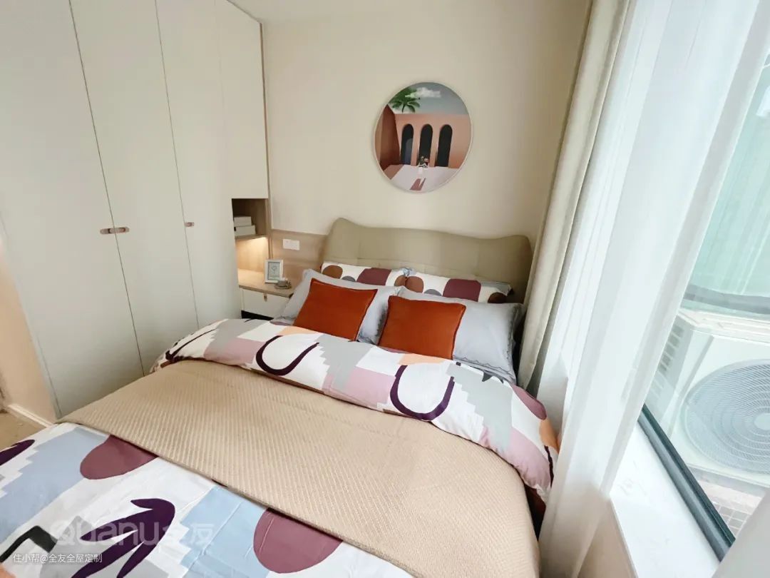 次卧床头柜与衣柜做一体式转角设计,适合小户型卧室,美观实用设计感十足。