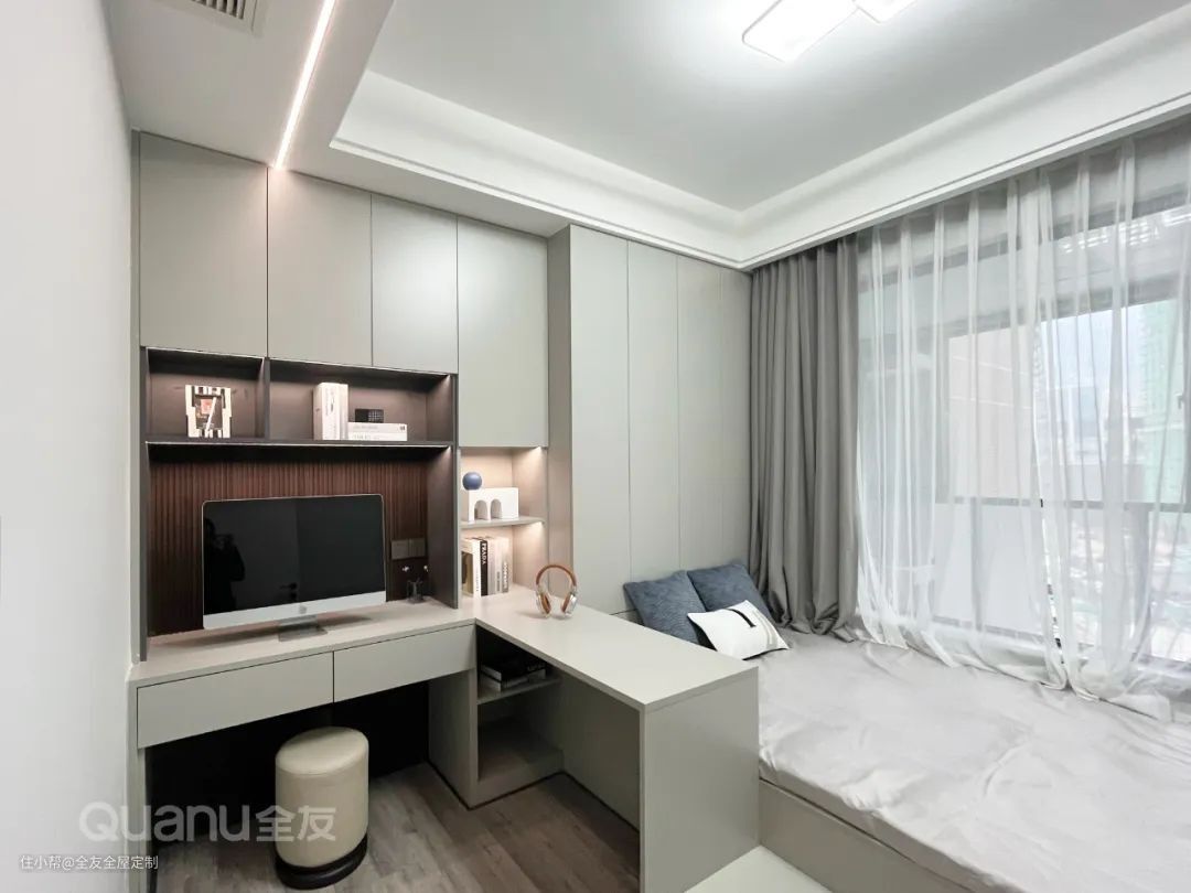 功能房做榻榻米+衣柜+书桌柜组合设计,L型书桌形成围合式布局,学习、休息时都可随手置物,安全感满满。