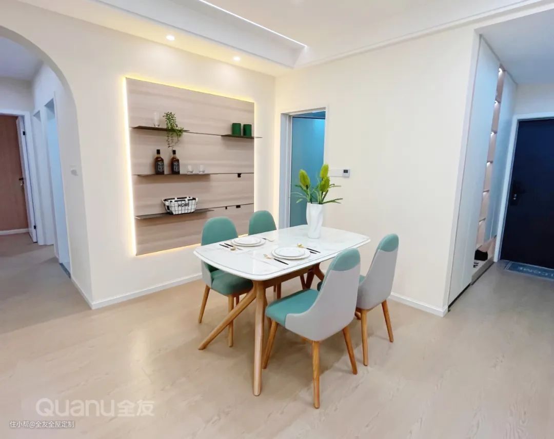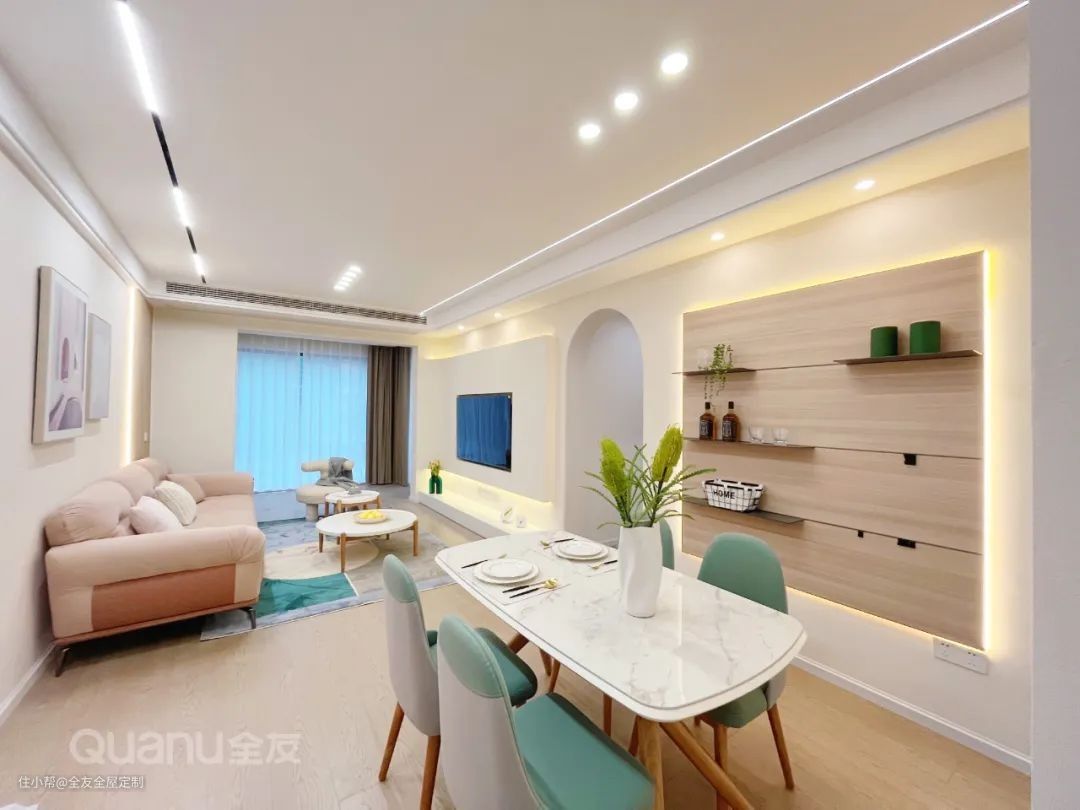 餐厅墙面用木饰面+暖光灯带装饰,自然温馨,再搭配多功能墙面家居,展示与收纳兼备。原木+豆蔻绿餐椅设计,清新治愈,空间更显自然。