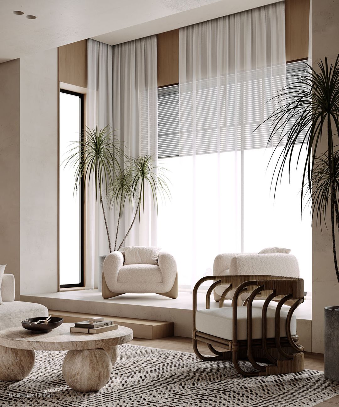 这个客厅注重材料和光线的运用。双面窗户引入了自然阳光,照射在现代米色沙发和柔软的圆形地毯上。这种设计通过充分利用自然光线,创造了明亮、通透的空间感。轻盈的米色调和自由的轮廓设计给客厅带来清爽和轻松的美感。
