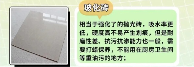 相当于强化了的抛光砖,吸水率更低,硬度高不易产生划痕,但是耐磨性差,抗污抗渗能力也一般,需要打蜡保养,不能用在厨房卫生间等重油污的地方。