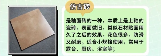 是釉面砖的一种,本质上是上釉的瓷砖,表面做旧,类似石材贴面用久了之后的效果,花色很多,防滑又耐磨,适合小规格使用,常用于露台、厨房、浴室等。