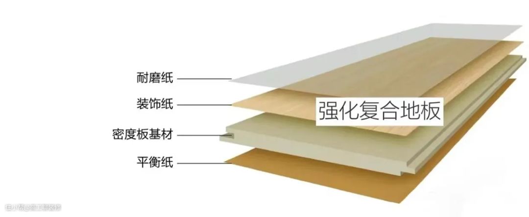 木地板分层:耐磨层、装饰纸、密度板基层、平衡层