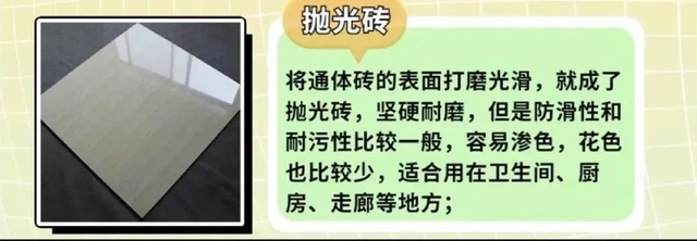 将通体砖的表面打磨光滑,就成了抛光砖,坚硬耐磨,但是防滑性和耐污性比较一般,容易渗色,花色也比较少,适合用在卫生间,厨房、走廊等地方。