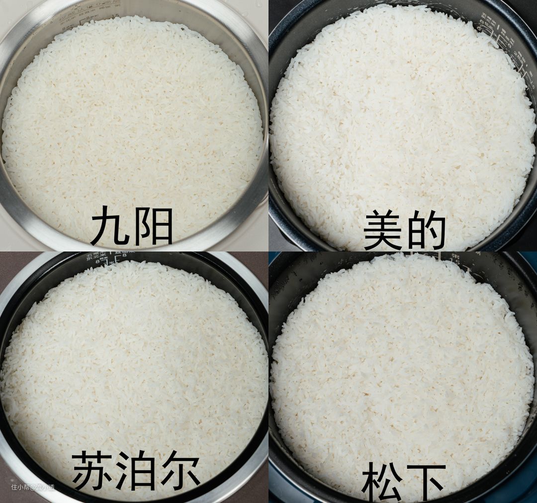 单从米粒状态来说,九阳和美的的颗粒饱满,松下和苏泊尔的膨发状态差一点