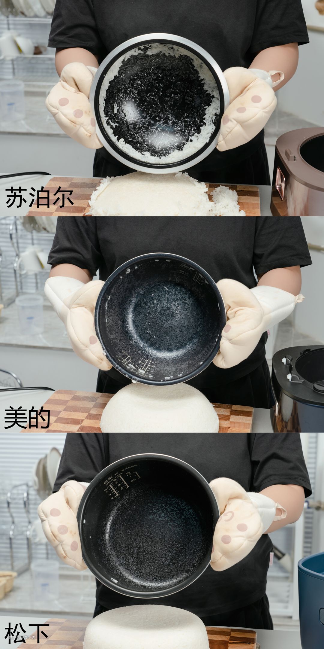接下来看看其他几款电饭煲倒扣米饭后内胆里的情况,可以看到,苏泊尔倒扣出米饭后,虽然没有糊底,但内胆里残留了粘住了一大圈的米饭,美的跟松下多多少少还是粘了一些米饭在锅里,被黏住结块的米浆也有不少。