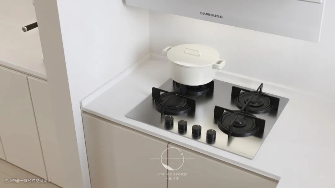 ②業主平時做飯比較少,飲食清淡,廚房打通改成開放式,視覺上客餐廳顯得空間更大;