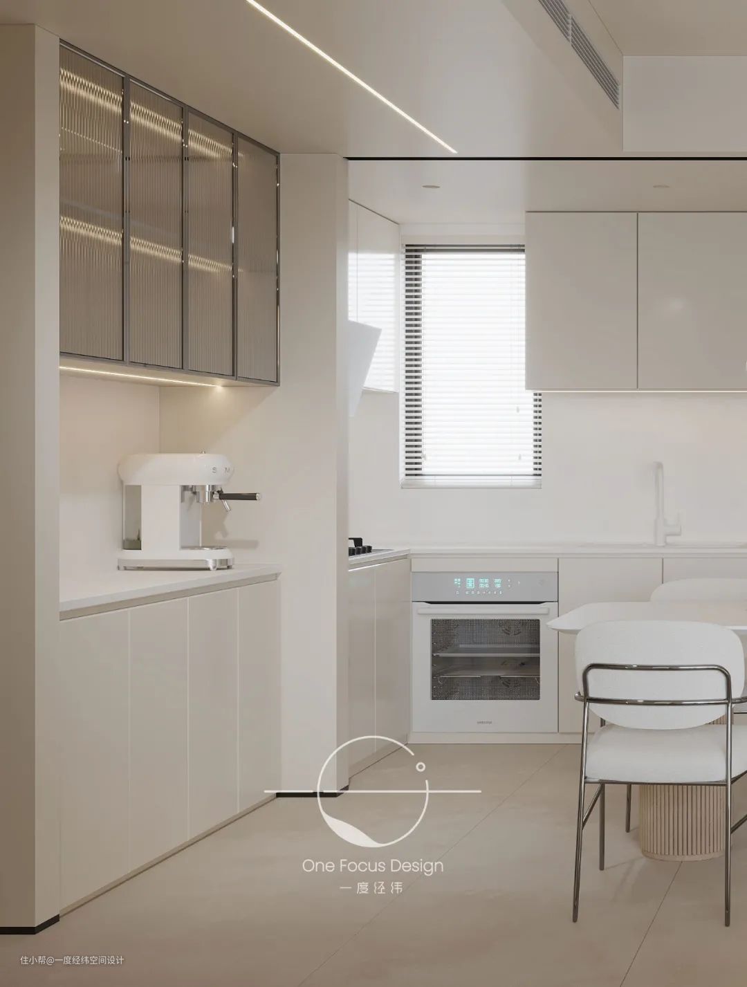環顧餐廳和廚房的墻面做櫥櫃,冰箱、烤箱等廚房電器都嵌入櫥櫃裏。開放式的廚房設計,家人之間可以一邊烹飪一邊聊天,享受廚房帶來的溫馨時光。