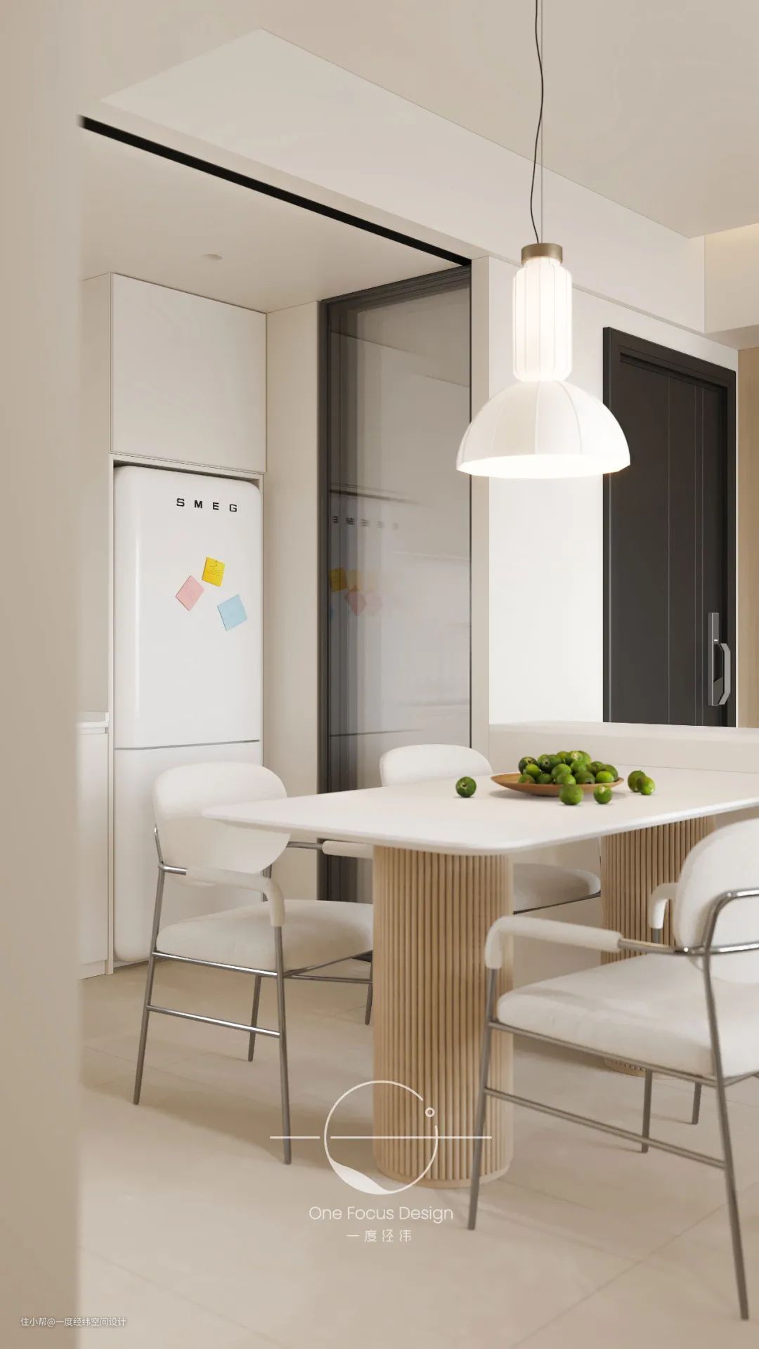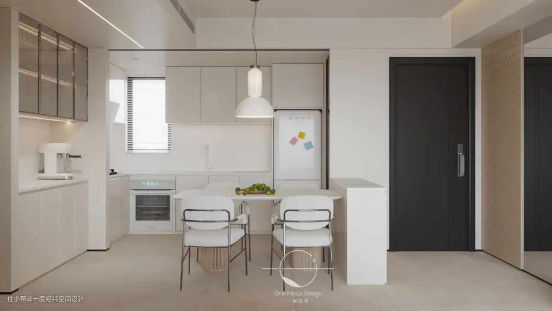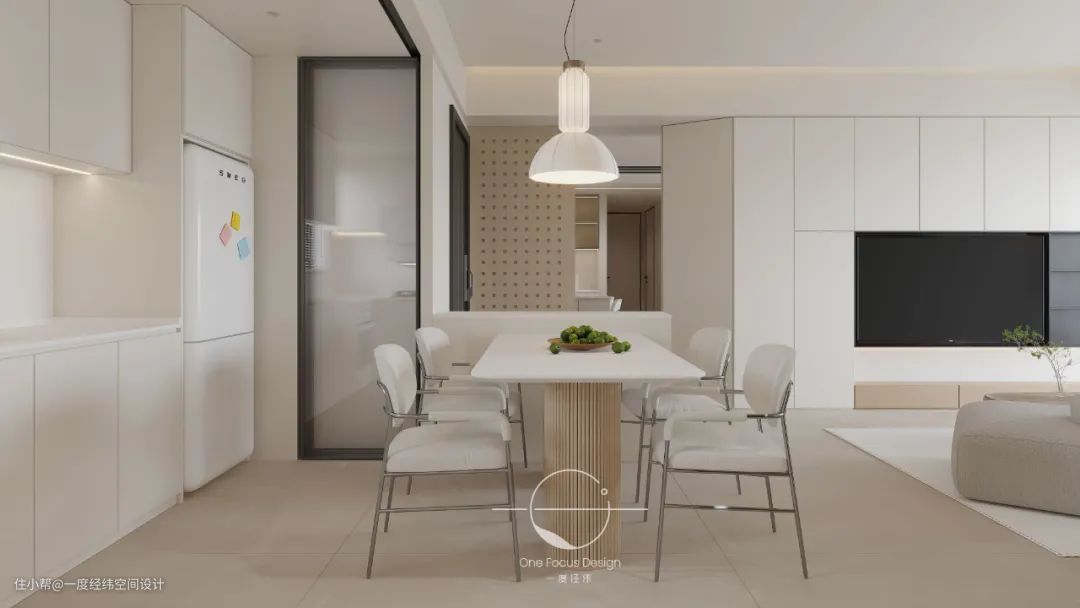 白色的巖板餐桌、白色的烤漆餐櫃、白色的乳膠漆、白色的水泥磚地面,設計師將餐廳做到了白的極簡。