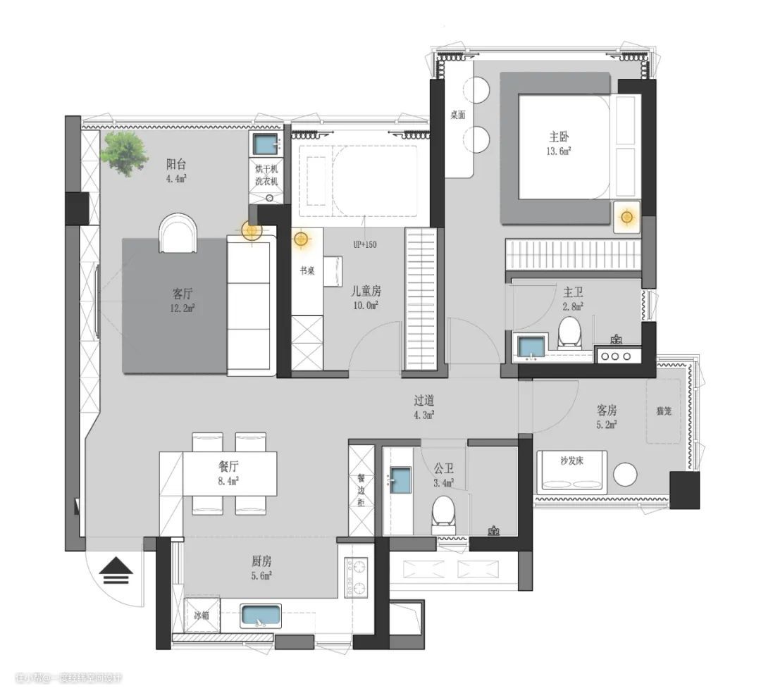 ④原來陽臺狹長的那一段空間納入了兒童房,兒童房門改到中間,一邊是衣櫃,另一邊是書桌學習的位置,窗戶邊擡高的位置做了地臺,放上床墊就是睡覺的區域,增大了學習玩耍的活動空間;