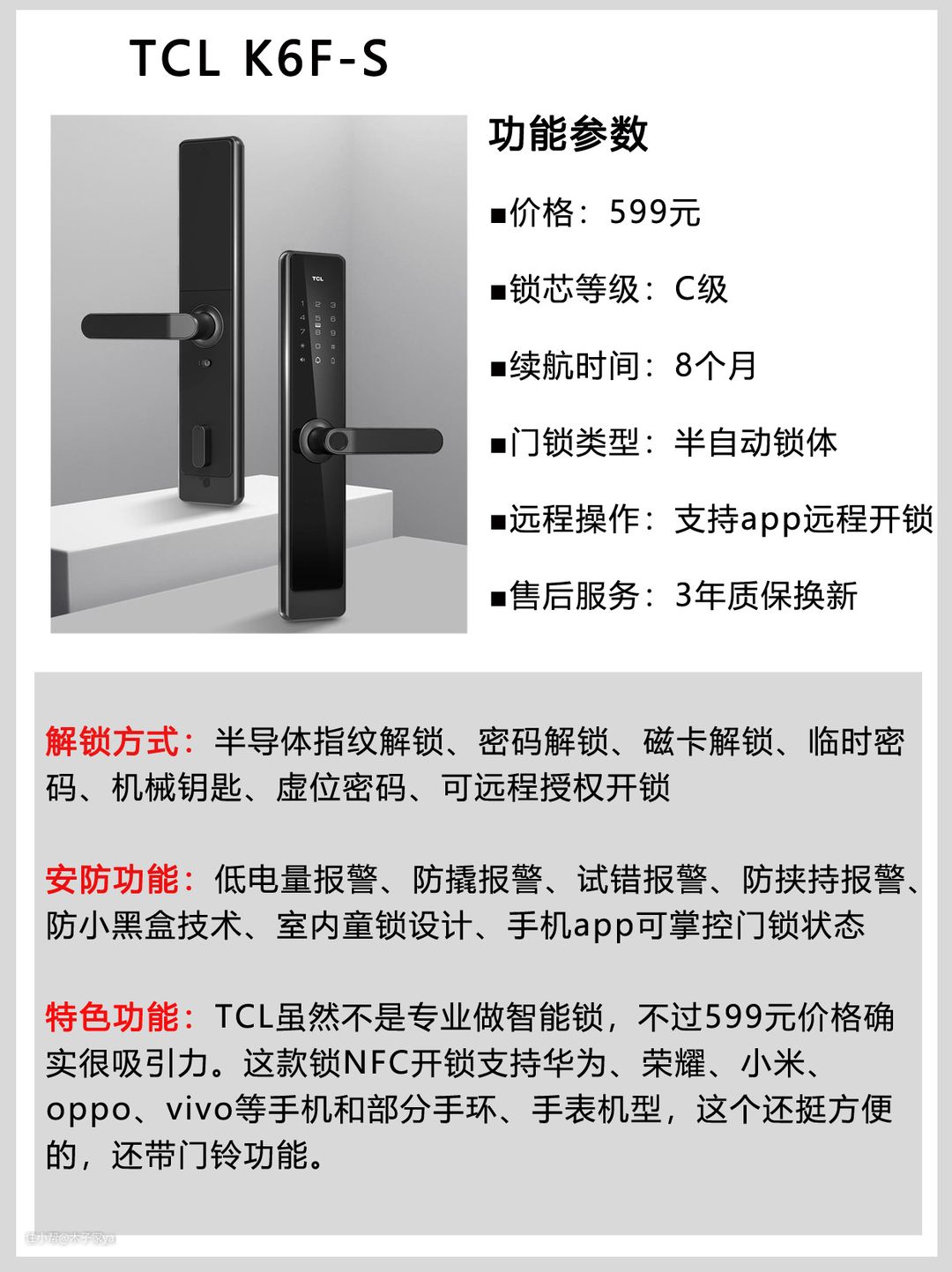②TCL智能锁K6F-S,599元