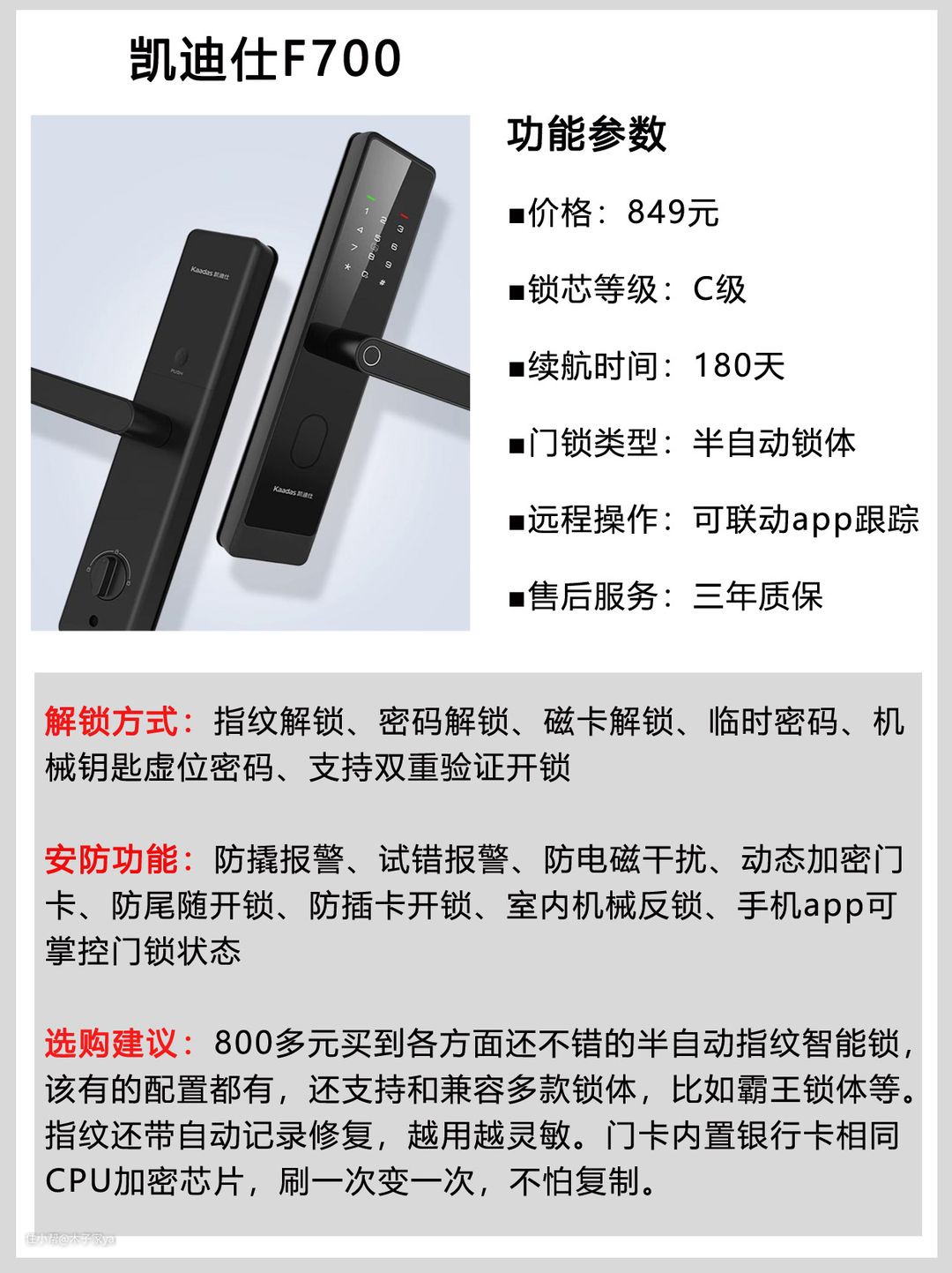 ①凯迪仕智能锁F700,849元