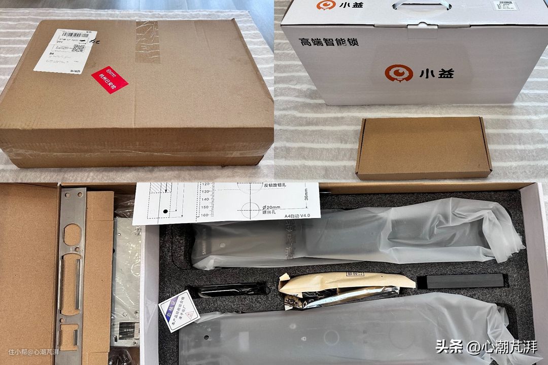 ▲拆开小益T6的包装盒,里面有一大一小两个纸盒,分别装着智能门锁以及锁体。