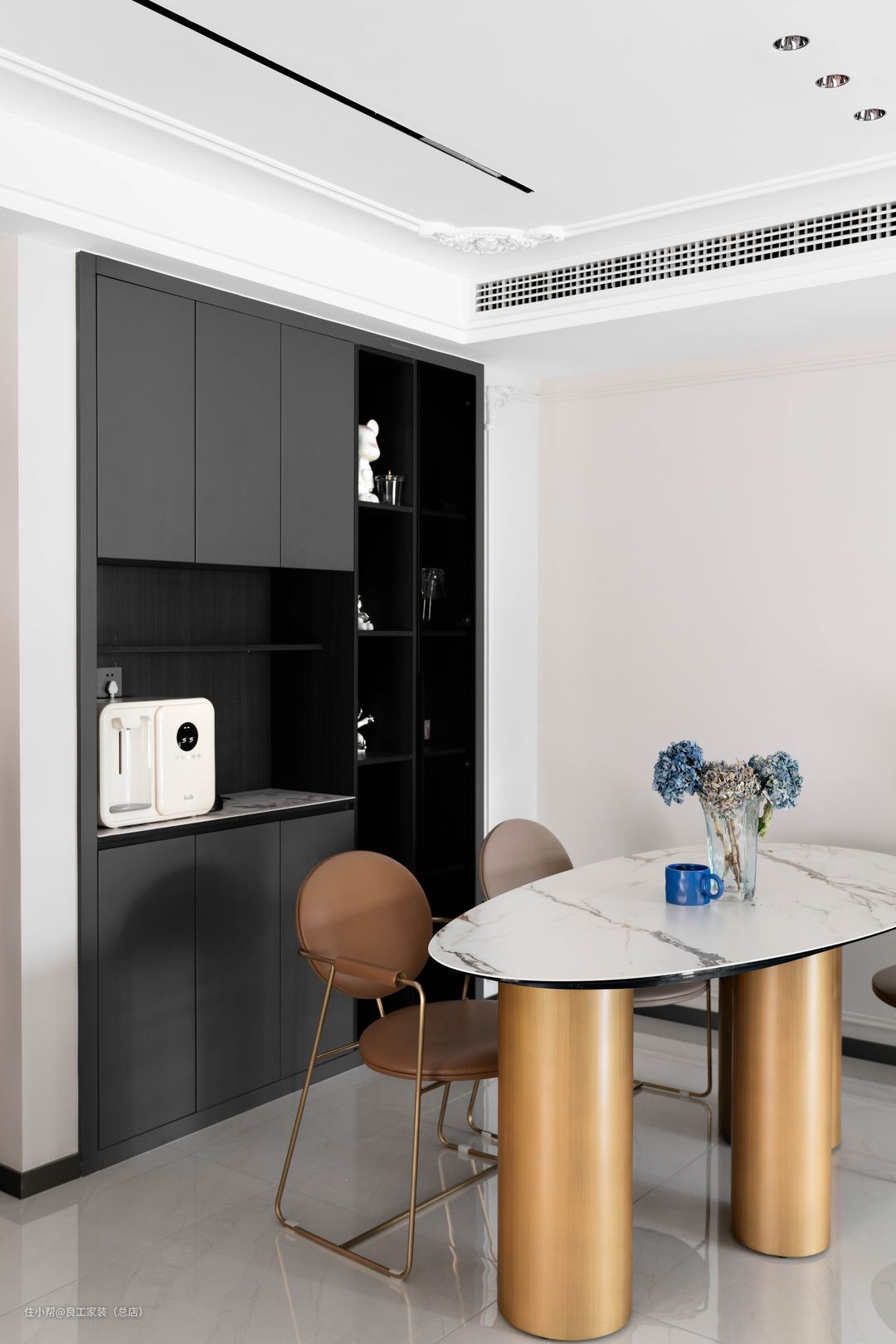 金属桌腿的岩板餐桌搭配皮质餐椅,围合出一日三餐的仪式感。嵌入式餐边柜充分利用墙面空间,开合有序的柜体结构兼具储物与展示功能,皆是考虑到生活真实所需。